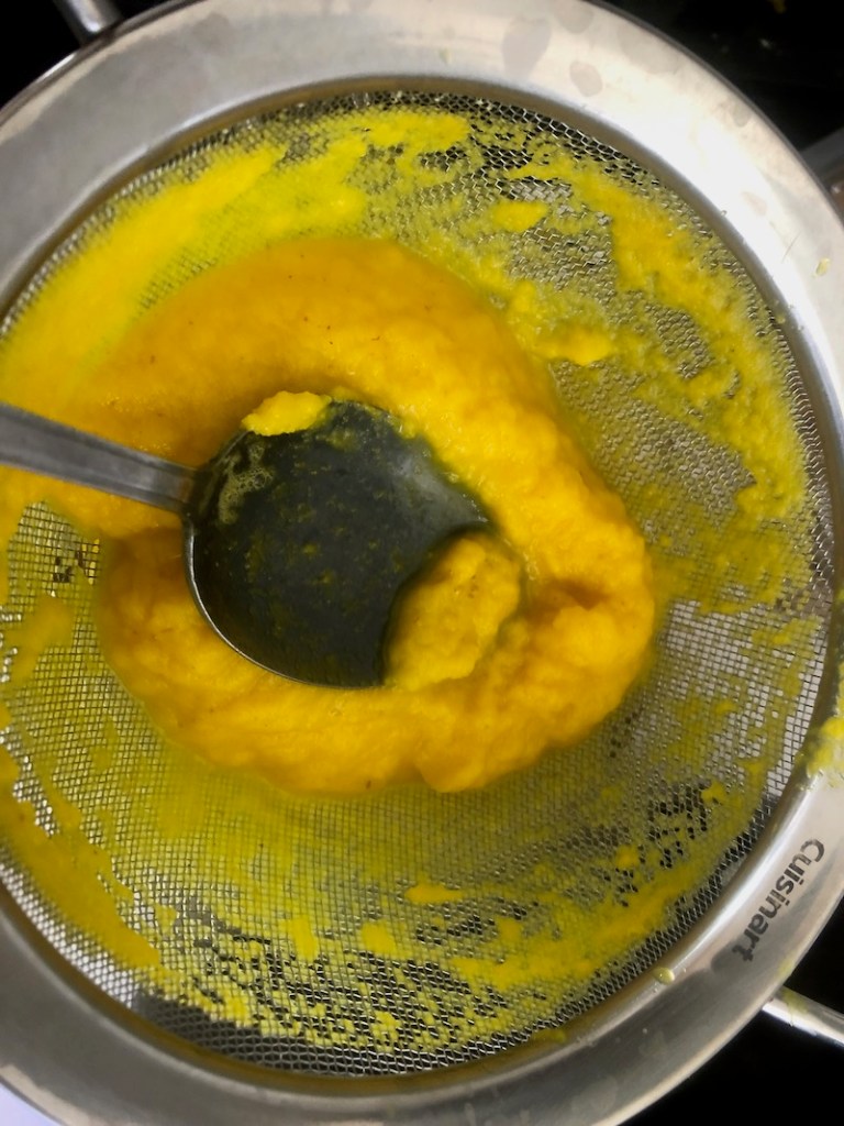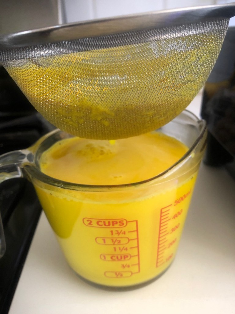 It’s best to start the blender on low, progressing to a higher setting as the ingredients get smoother. I also place my hand on the lid to stabilize the blender. Eventually it will be fully pulverized, and time to strain it.