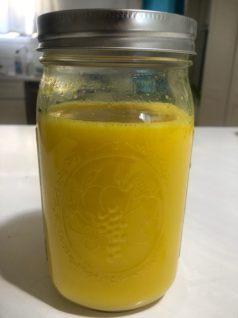 Place your ingredients in the blender, along with desired sweetener. You could try stevia, agave, or maple syrup. I like stevia or agave in mine. You can even add a pinch of cayenne too. Blend for about 2-3 minutes until completely blended. It will begin to turn a bright vibrant yellow, mainly due to the turmeric. Be careful not to get it on your counters, or clothing, since this stuff stains.