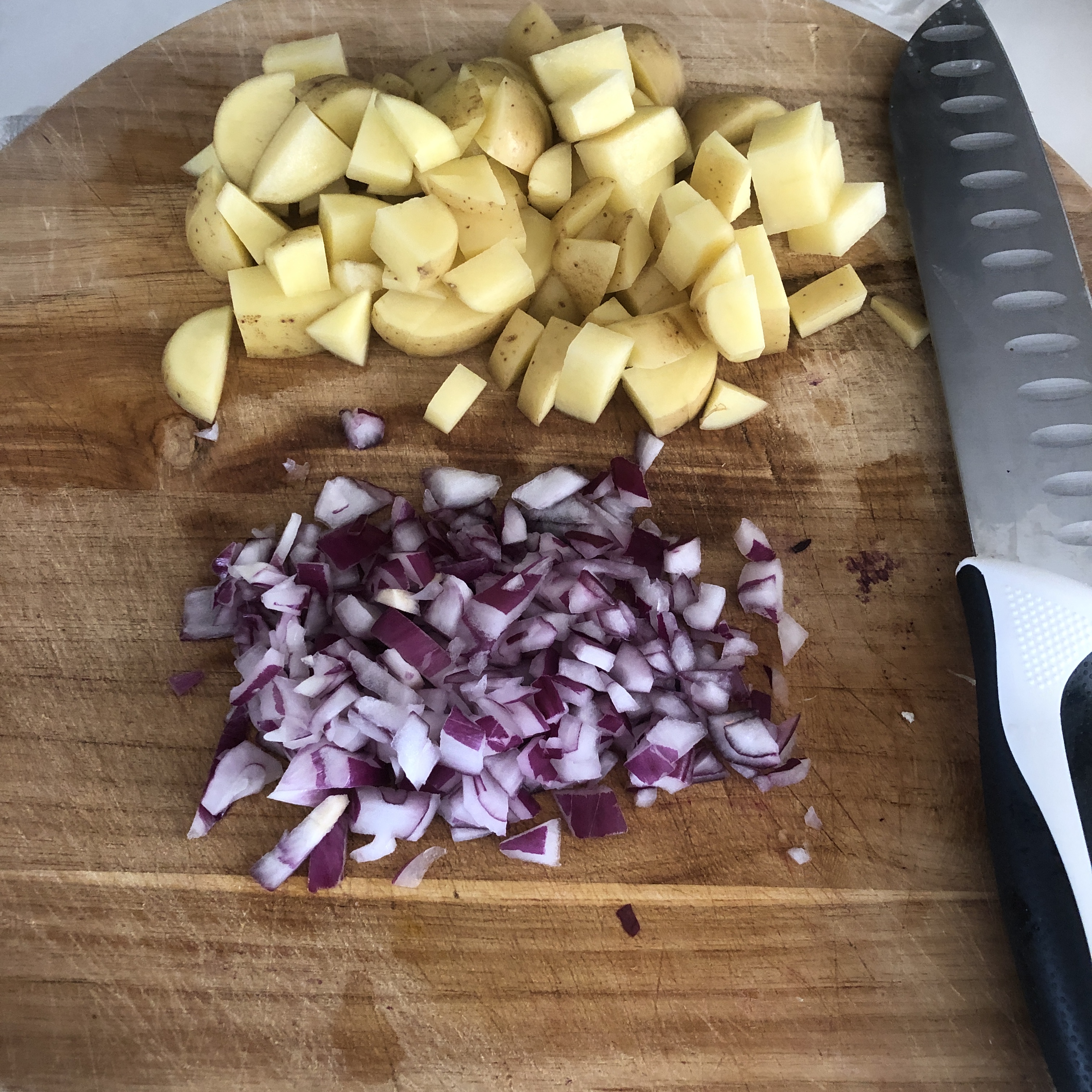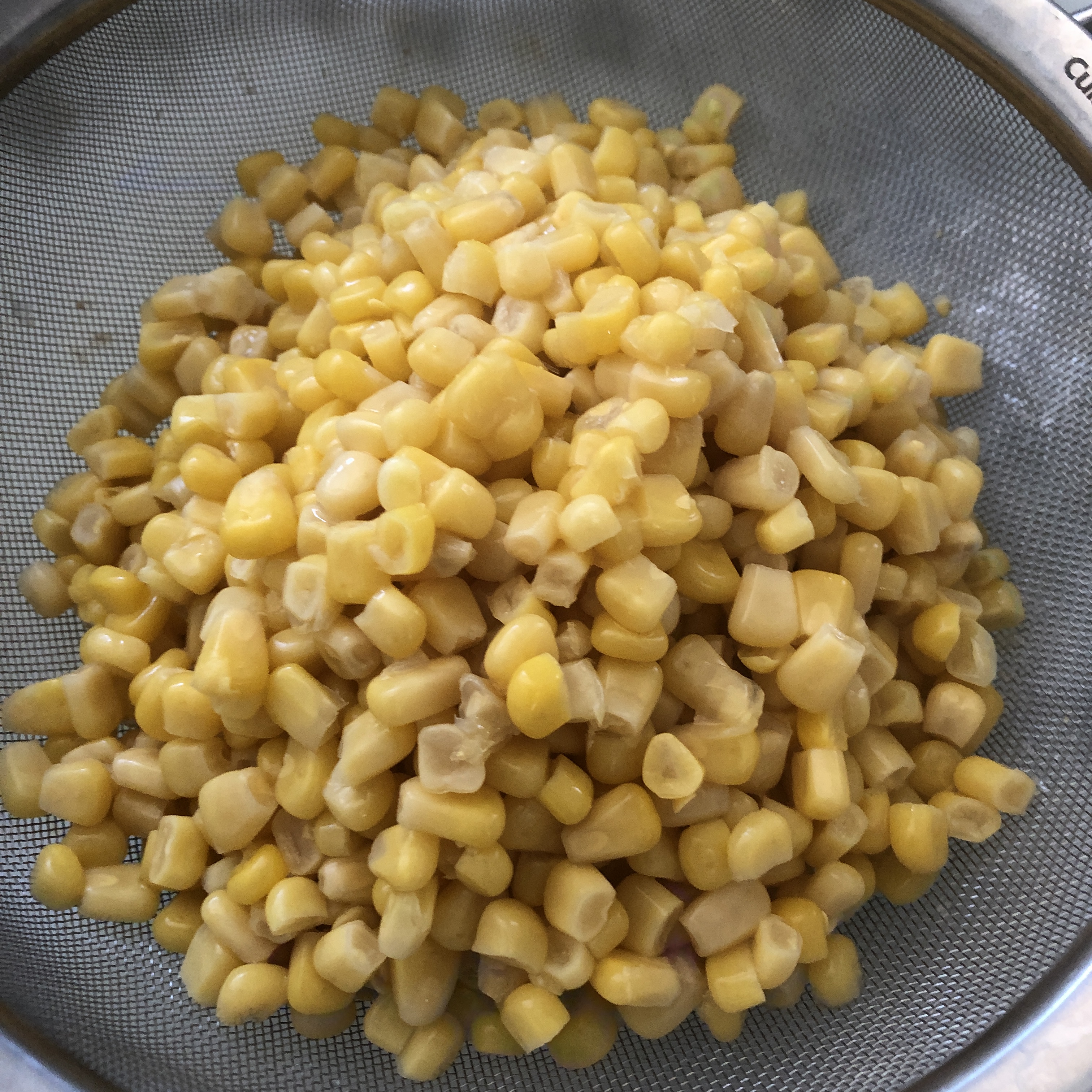 First, I drained 2 cans of corn, cubed 2 white potatoes and diced half an onion.