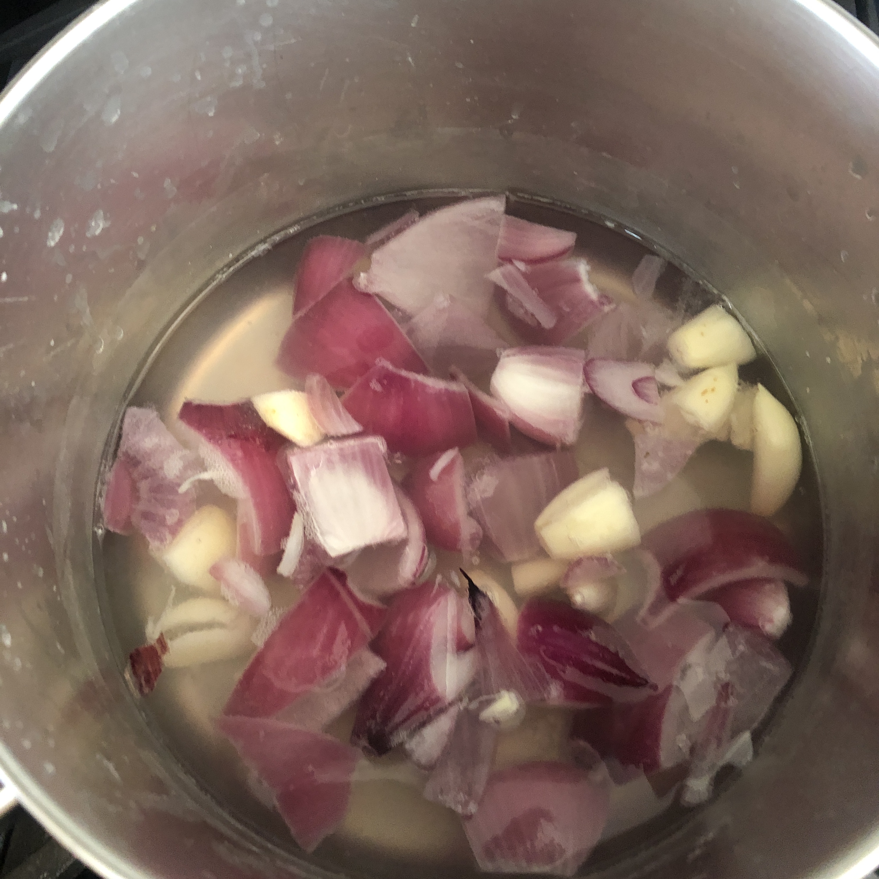 I got 2 cups of water boiling with the rough chopped onion, and garlic.