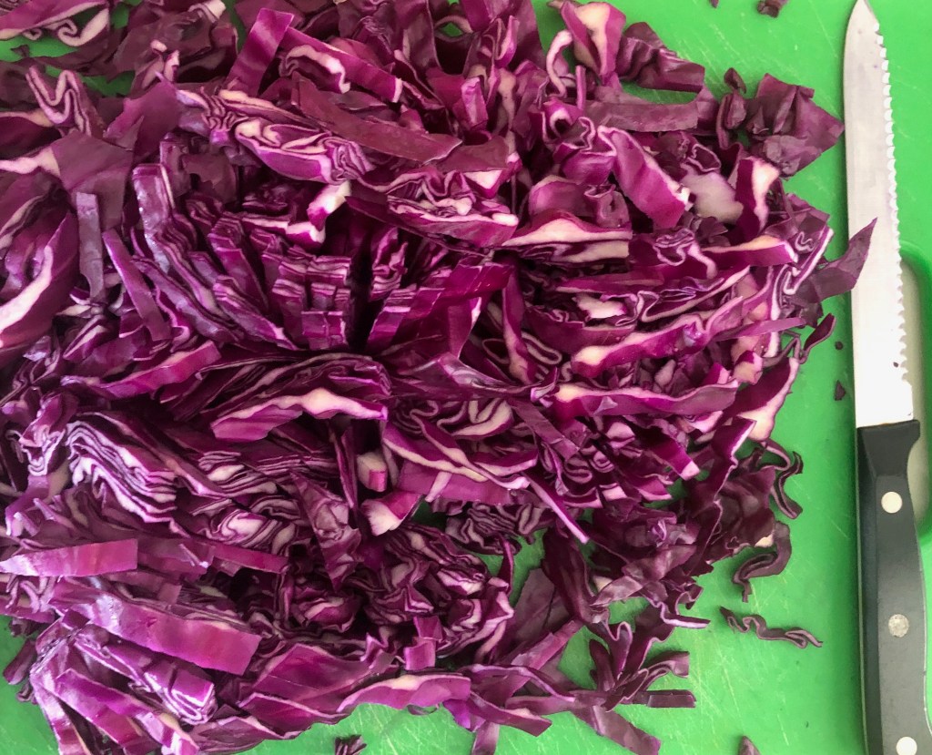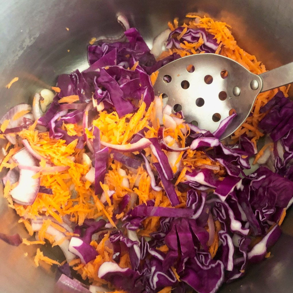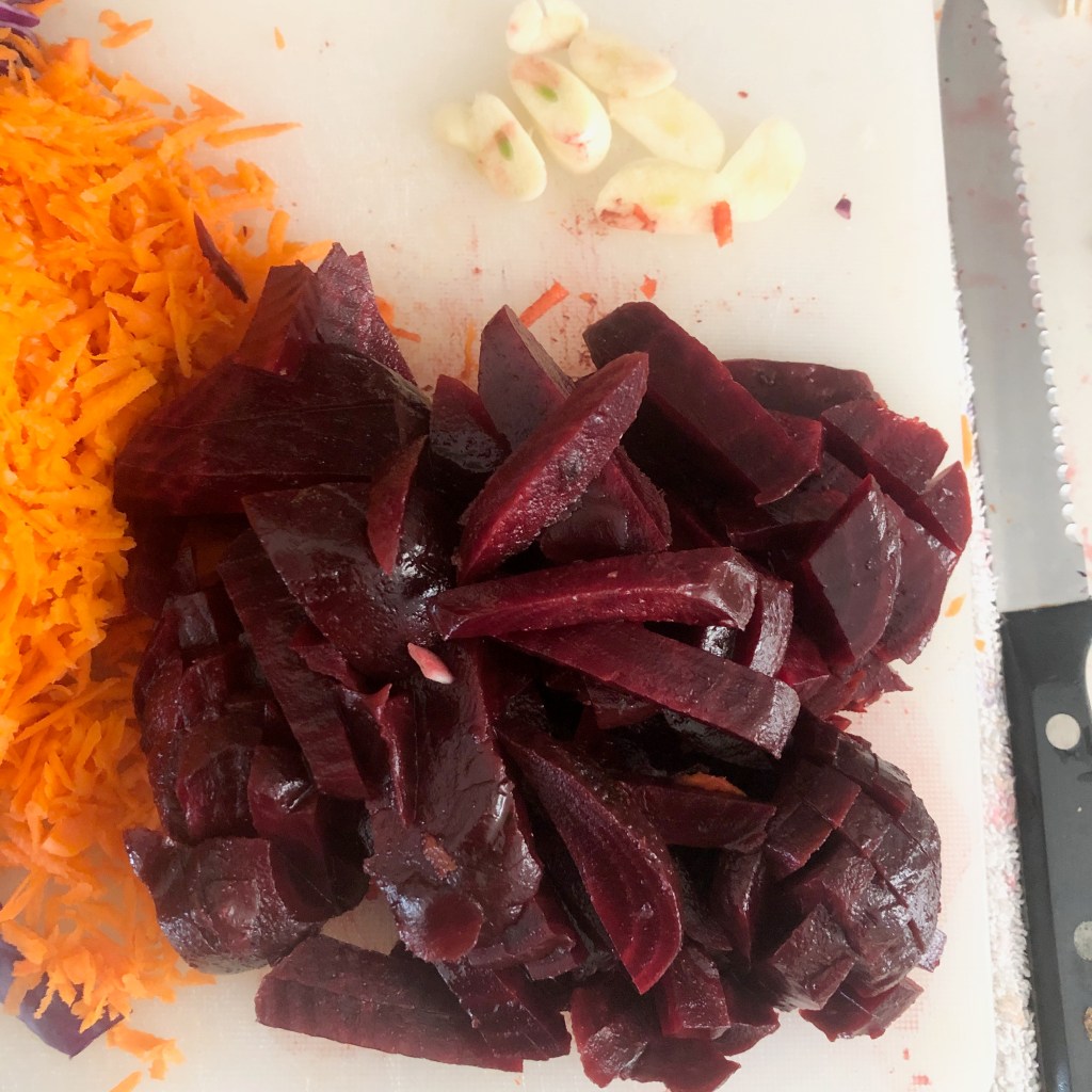 Now slice the garlic cloves, and the beets. They can be either precooked, raw, or fermented, it’s up to you. Add extra cooking time, if using raw uncooked beets, I had precooked, leftover from another day, so I used them this time, but normally I start with fresh (add 10-15 min extra).