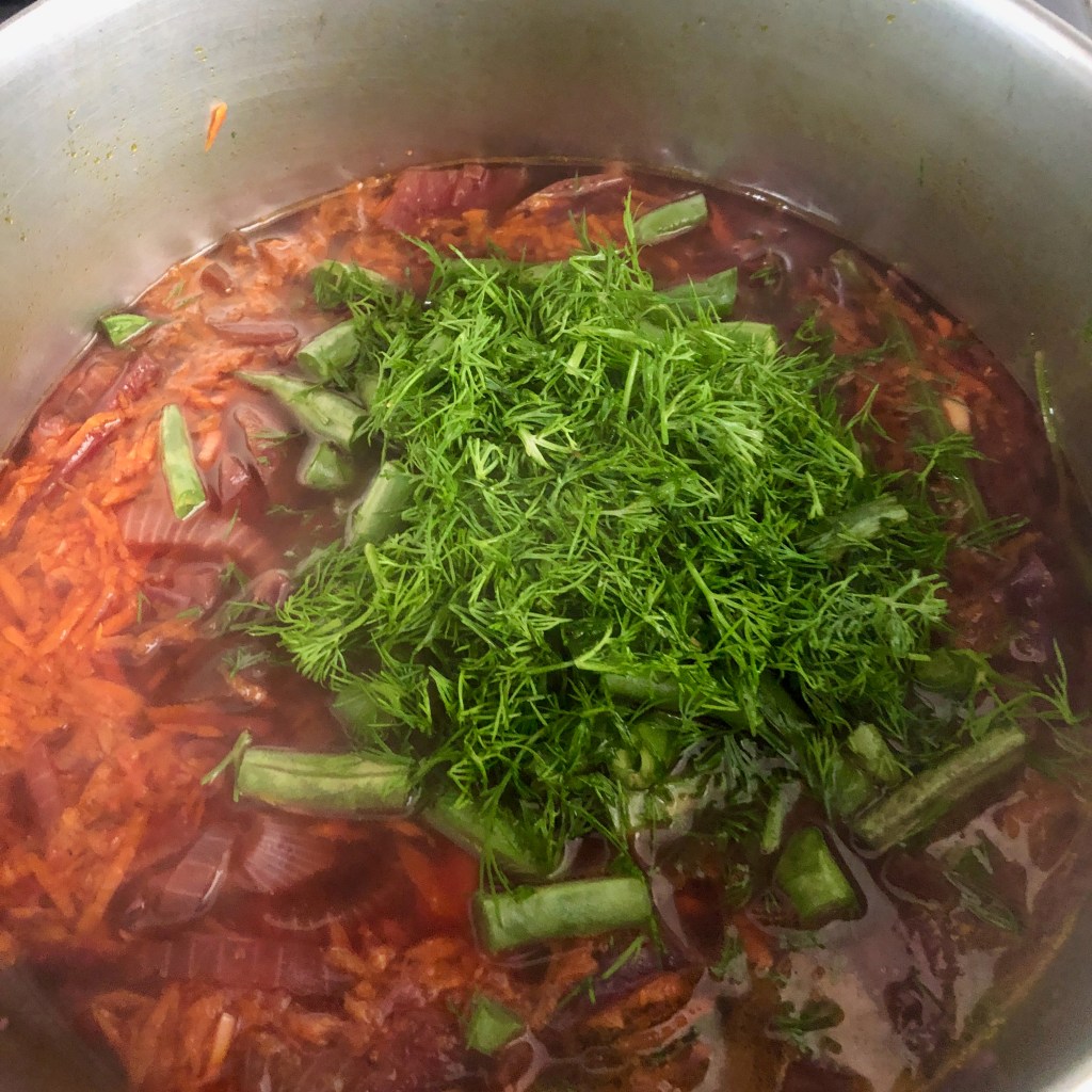Now simmer for 15 minutes before adding the cooked diced white potato, dill, and the green beans. Stir for 5 more minutes, seasoning to taste with salt, and pepper.