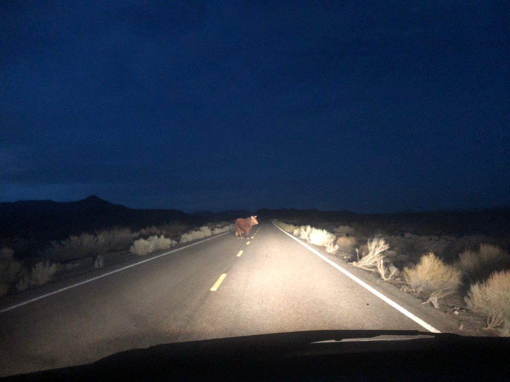 Suddenly see a large brown cow right in the center of the road. It seems oblivious to my bright lights. I begin slowing down to a crawl, hoping it will move.
