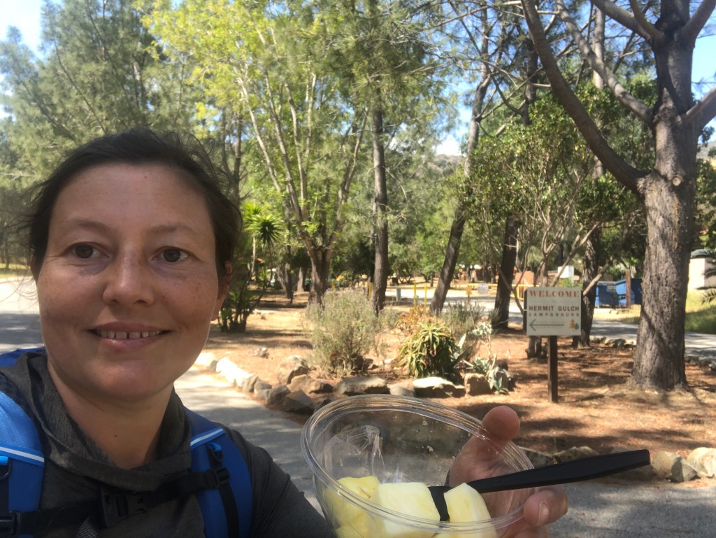 I made it to Vons and grabbed some Vitamin Water, along with a bowl of fresh pineapple, something I would not enjoy again for several days. Vitamin Water bottles are sturdy, with a wide mouth, so they are great for putting coffee, or electrolytes in. This bottle would be my extra 1/2 liter of hydration on my journey.