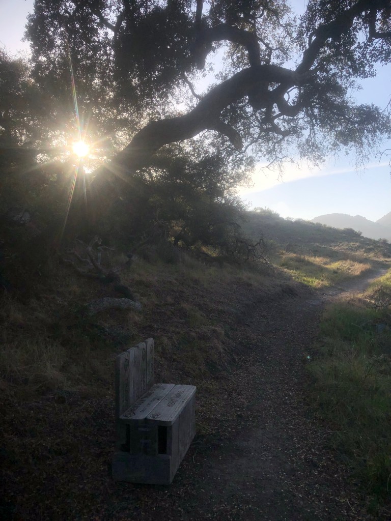 I made my way through a beautiful oak woodland, and passed a small bench, made from old Trans Catalina signs. I had maybe a mile or so to go now.