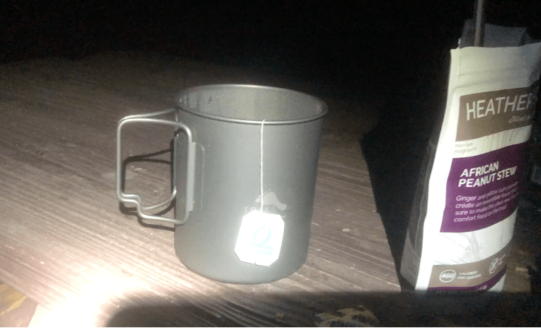 I decided tonight’s dinner in the wilderness would be Heather’s African Peanut Stew, which I had not tried before. I left some extra water in the pot for a cup of tea. I added a bag of Ginger Turmeric Tea in the pot, which doubles as a cup. I let the water boil for about 2 minutes, and poured it in the pouch. I put the food pouch into a dry sack to stay warm, since I had not brought a pot cozy. I blew up my sleeping pad in the meantime, and laid out my quilt, and liner. After about 15 minutes, and a good soak, I would enjoy the Peanut Stew.