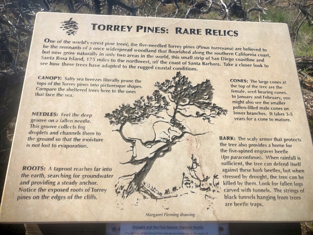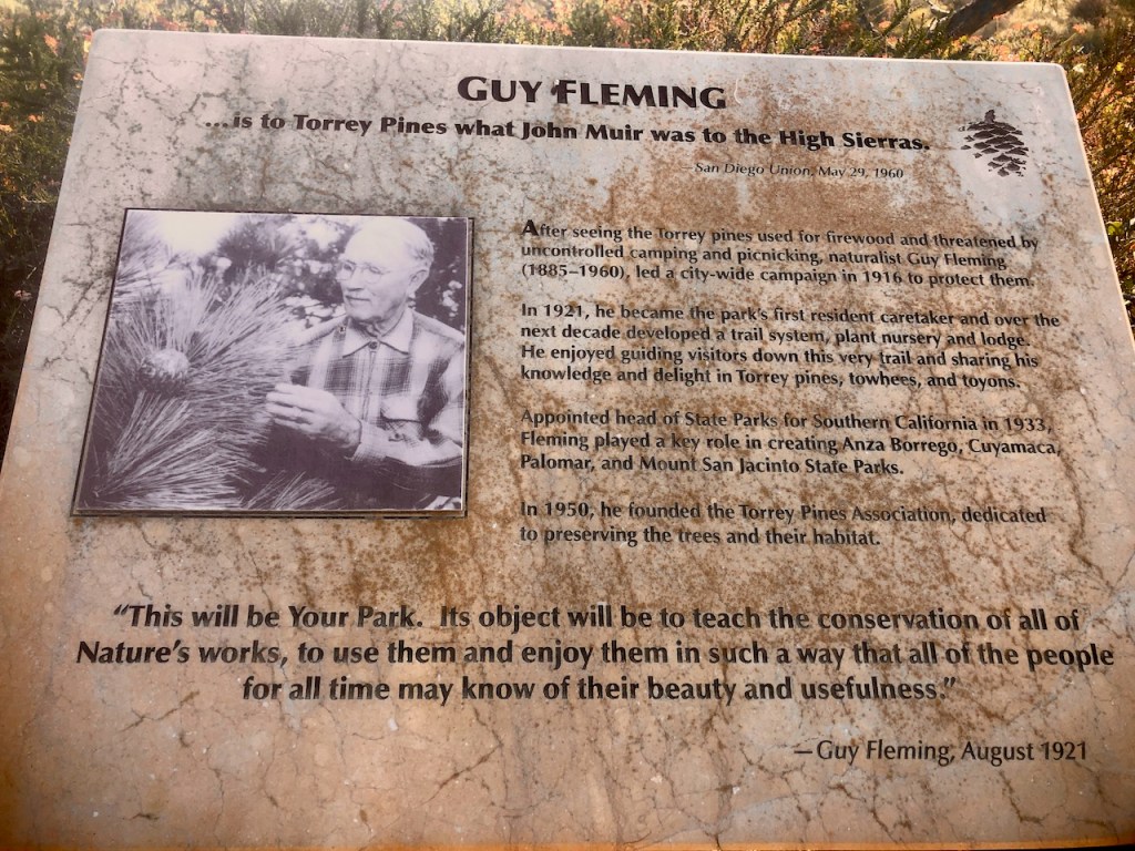 The first trail I came to was the Guy Fleming Trail. They say he was to Torrey Pines, what John Muir was to the Sierras. He was this park’s original resident caretaker, along with playing a role in creating other State Parks I have come to know and love, such as Anza Borrego. His goal was to inspire, and promote conservation efforts. This trail is part of his legacy. There would be several other plaques like this throughout the park, providing background knowledge on the surroundings here