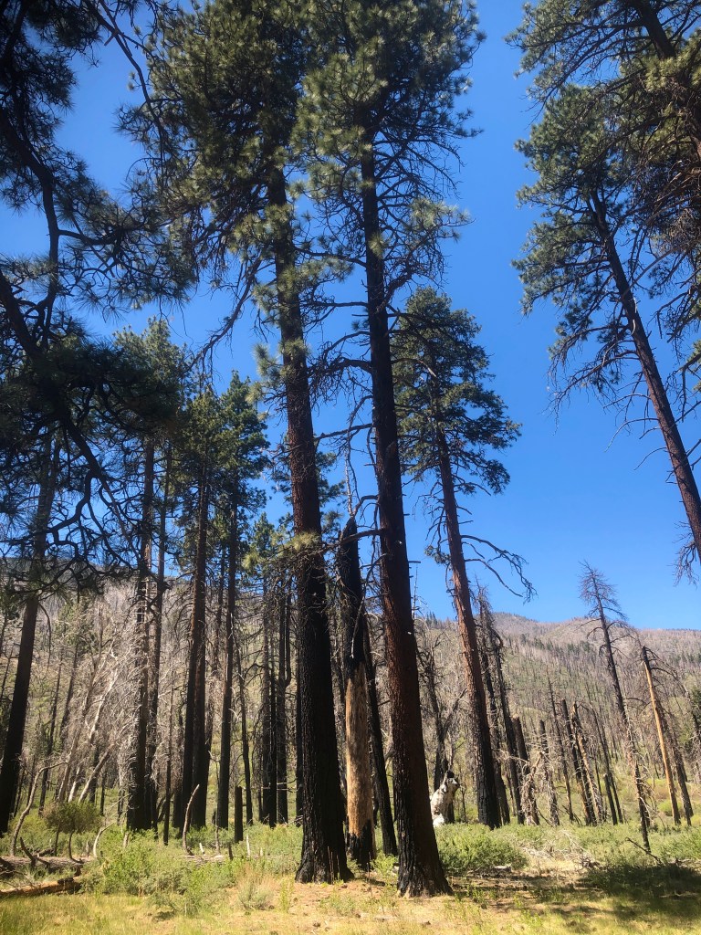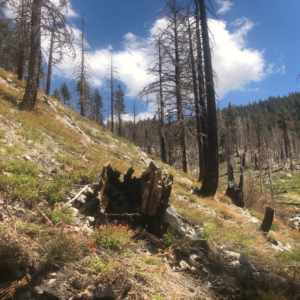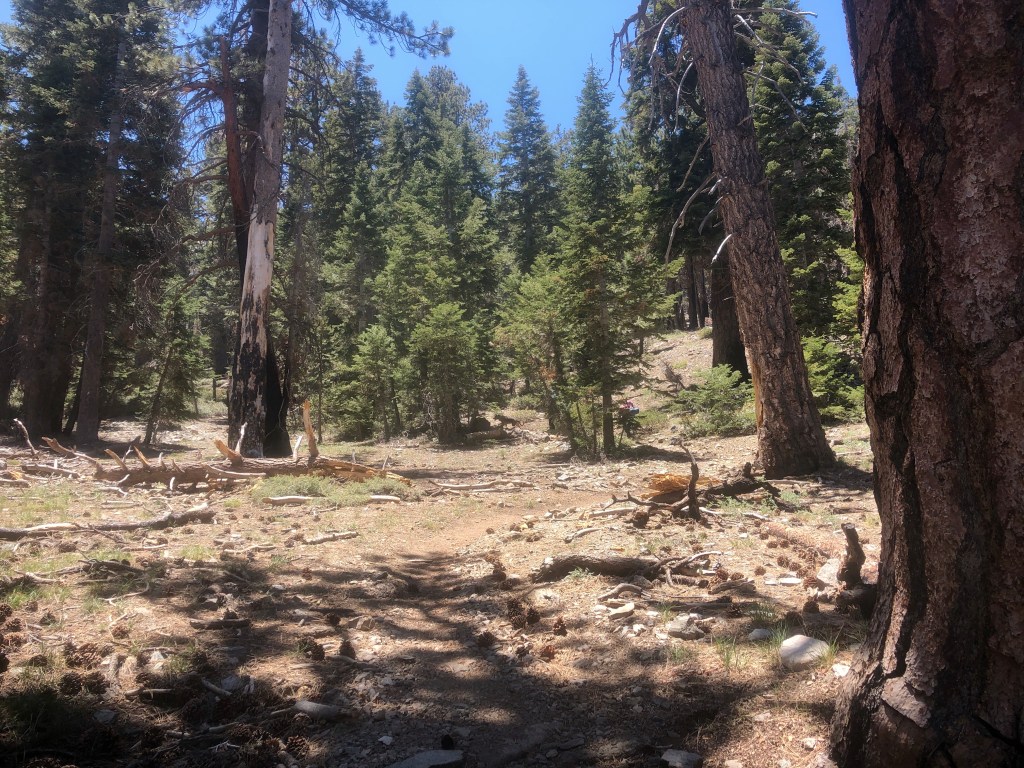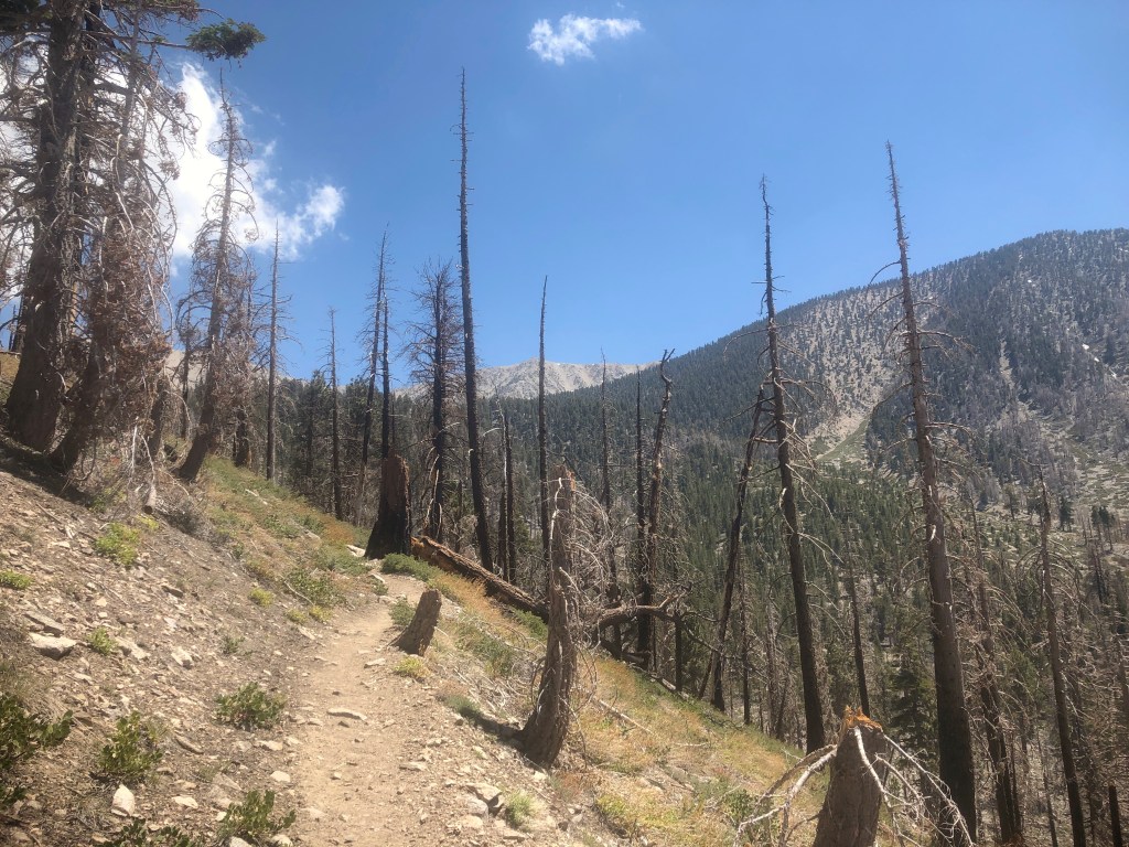 The trail took us on what felt like unending switchbacks, in the hot sun, and there was little shade here. We continued to pass more victims of the lake fire, along with plenty of live trees intermingling with those which did not. The forest survived, and reseeded itself, as they often do following a fire, since fire is needed for pines to open their cones, to spread the seed.