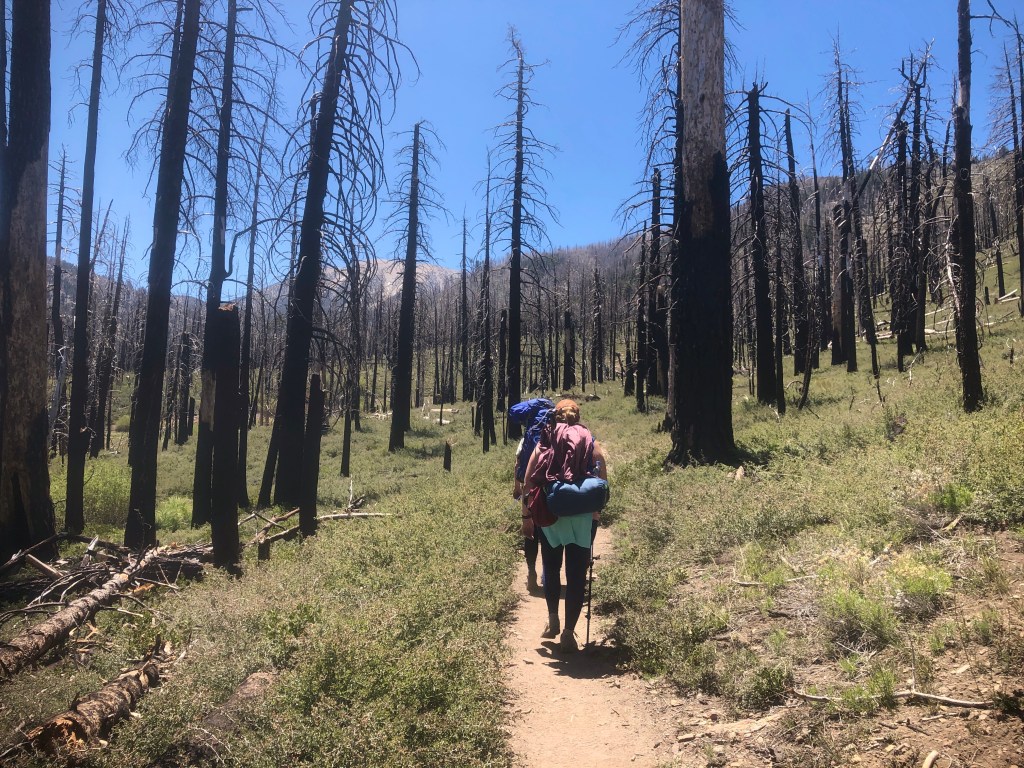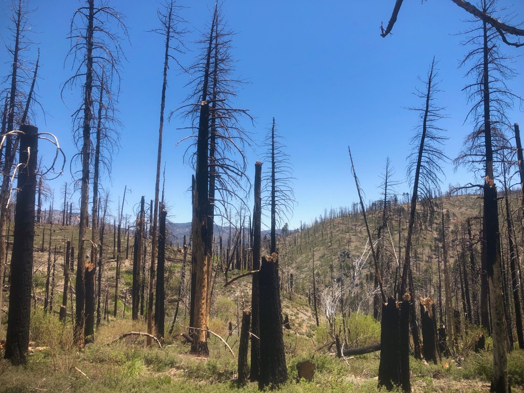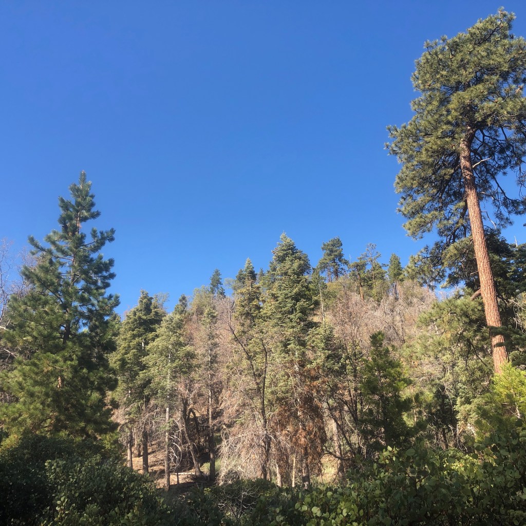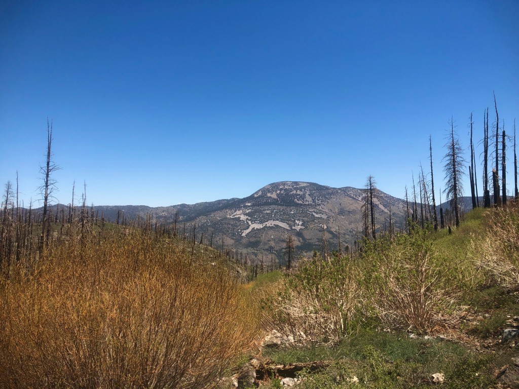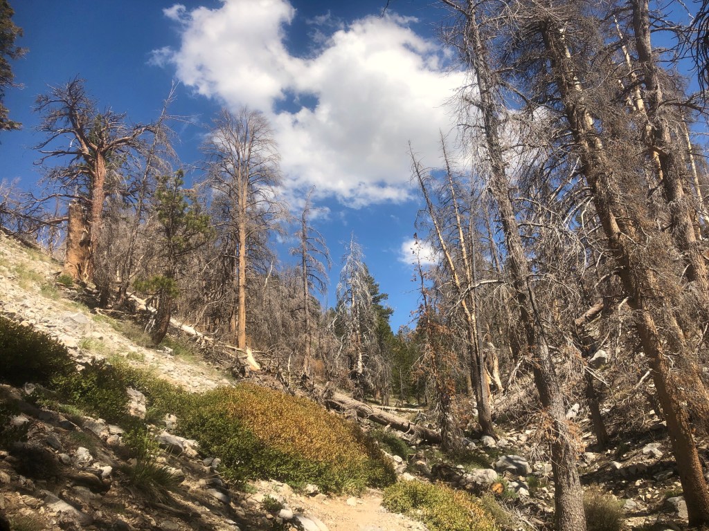 The trail took us on what felt like unending switchbacks, in the hot sun, and there was little shade here. We continued to pass more victims of the lake fire, along with plenty of live trees intermingling with those which did not. The forest survived, and reseeded itself, as they often do following a fire, since fire is needed for pines to open their cones, to spread the seed.