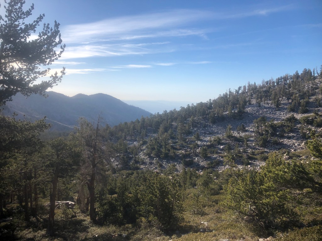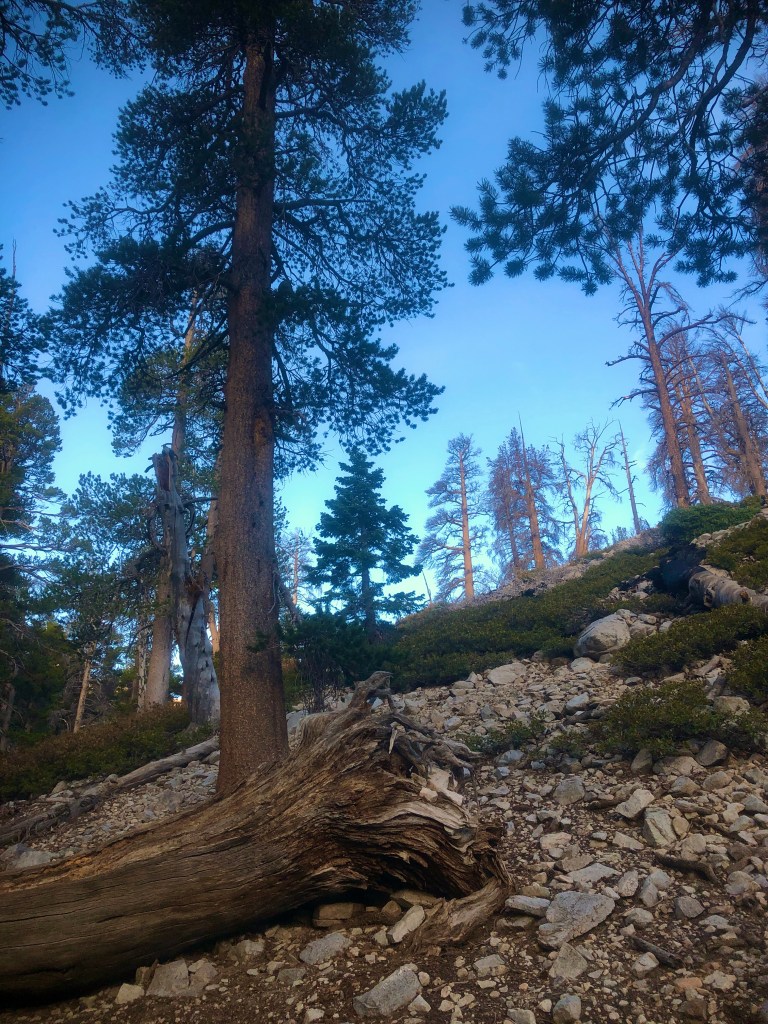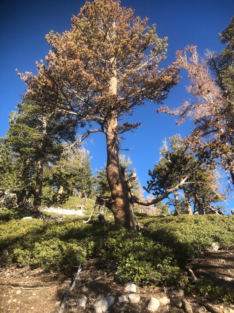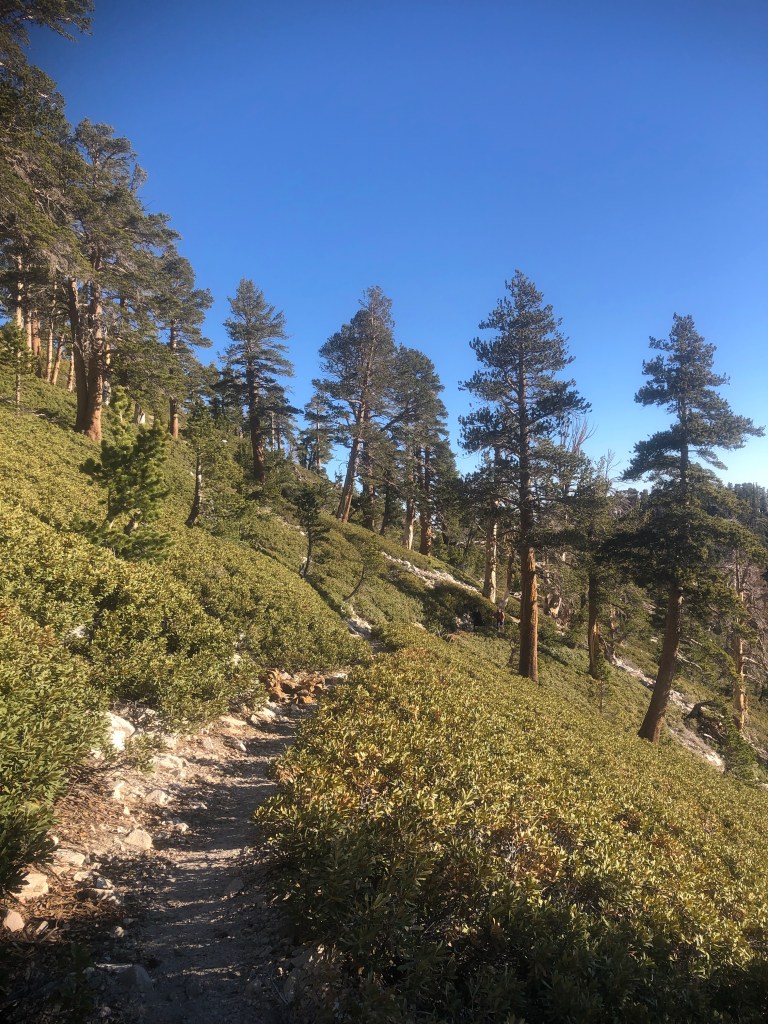 The trees of the South Fork Trail to Mt San Gorgonio included: Lodgepole Pine, Jeffrey Pine, Coulter Pine, Limber Pine, White Pine, Incense Cedar, Pinyon, White Fir , Black Oak, Holly, Scrub Oak, Live Oak, Hollyleaf Cherry, Manzanita, and Mountain Whitethorn,