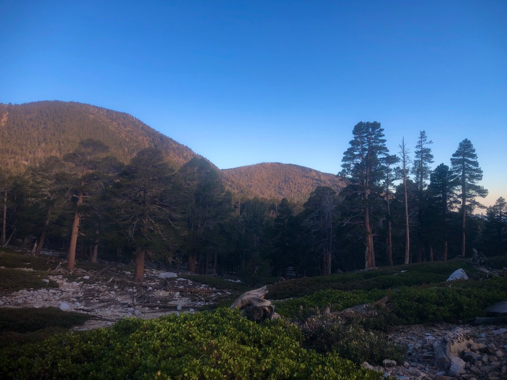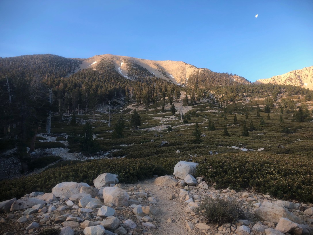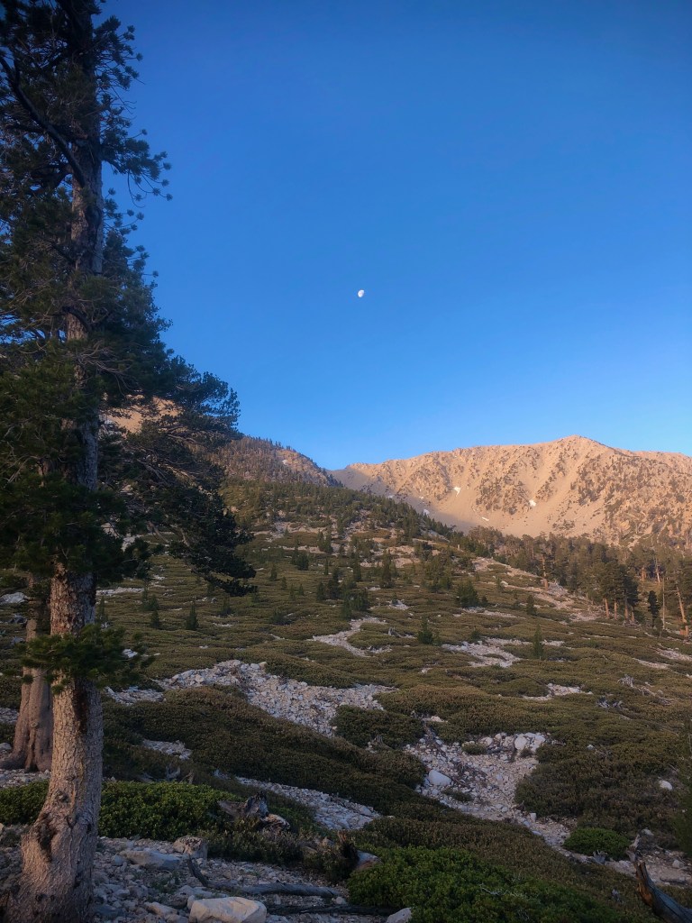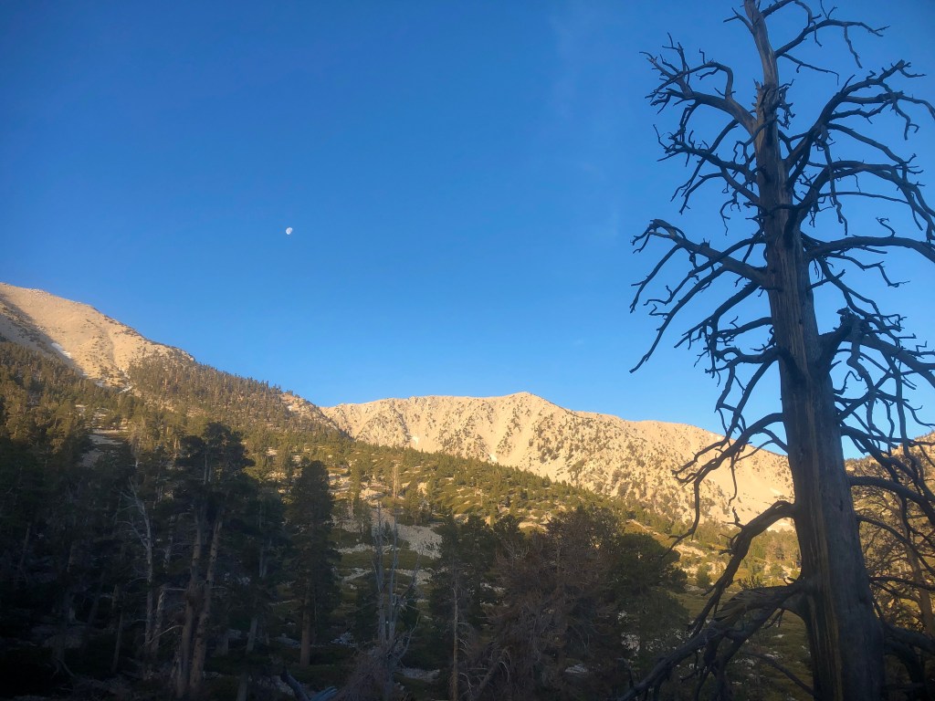 My morning beginning my hike in the moonlight, beneath Mount San Gorgonio was very chilly, yet tranquil. I was wearing all my clothing. I was very cold even in two pairs of socks. The only way to get warm was to get on the move.