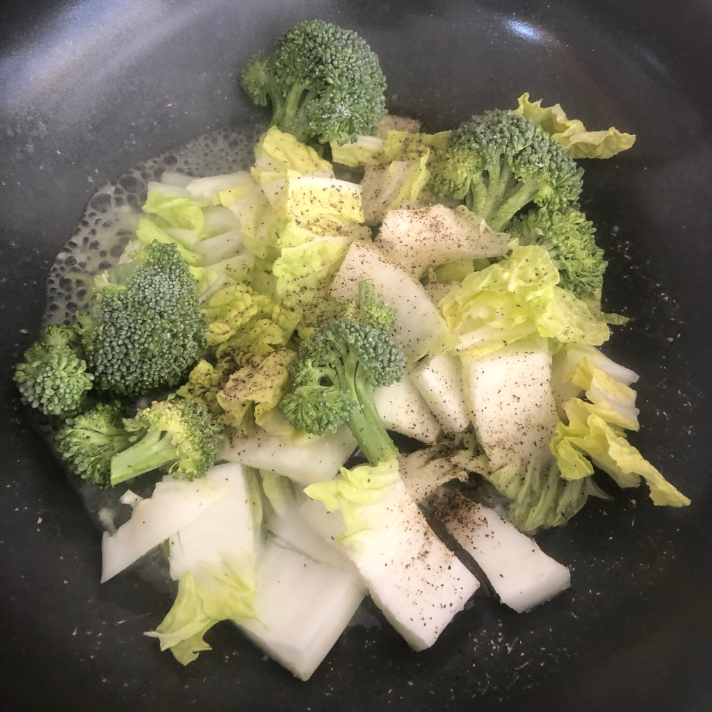 I proceeded to chop up all my veggies for the dish, which would be napa, and broccoli, reserving the peeled chopped stems for a broccoli soup another day. I diced up half a large jalapeno, and about 2 tbsp of red onion. Those would go in the Spicy BBQ Peanut Sauce.