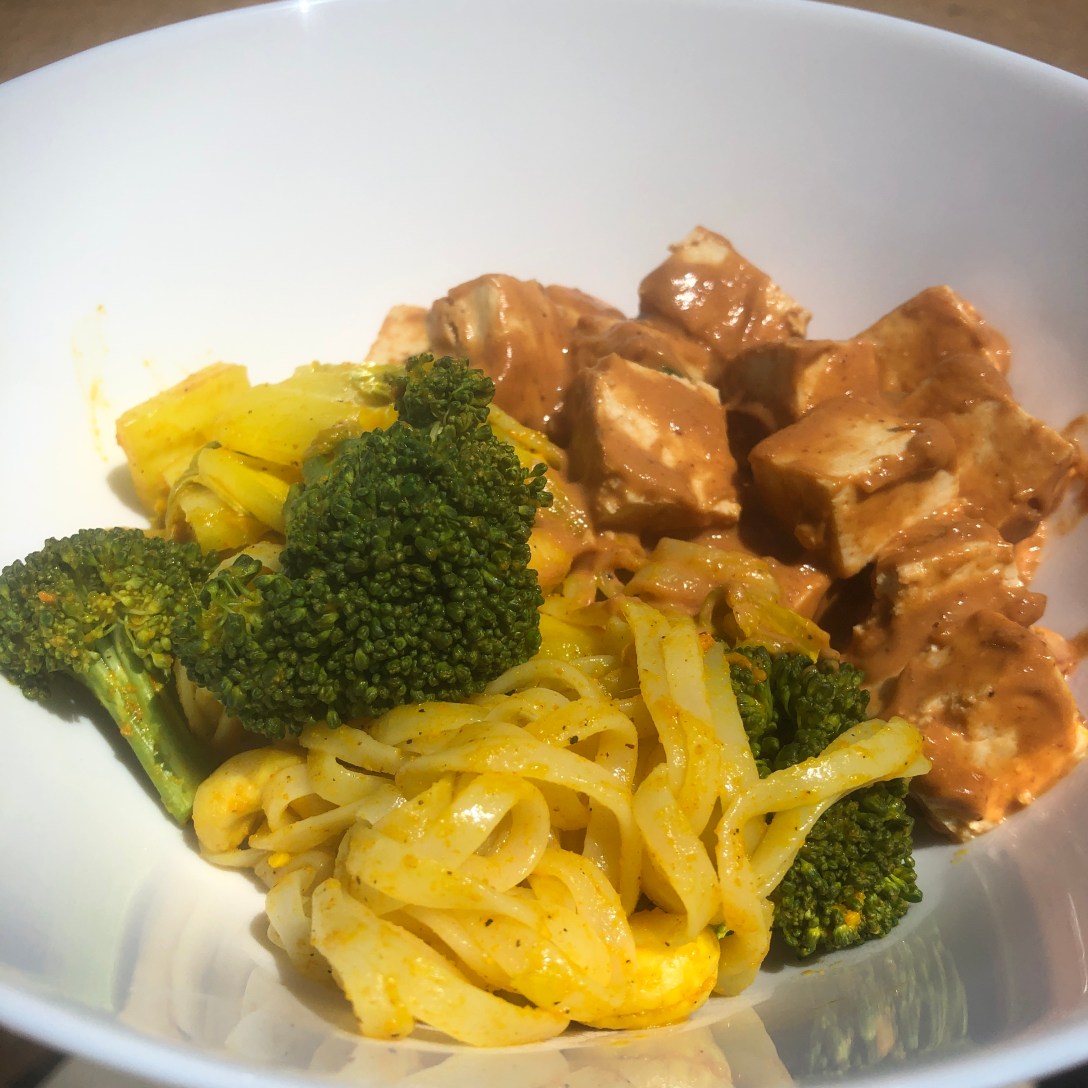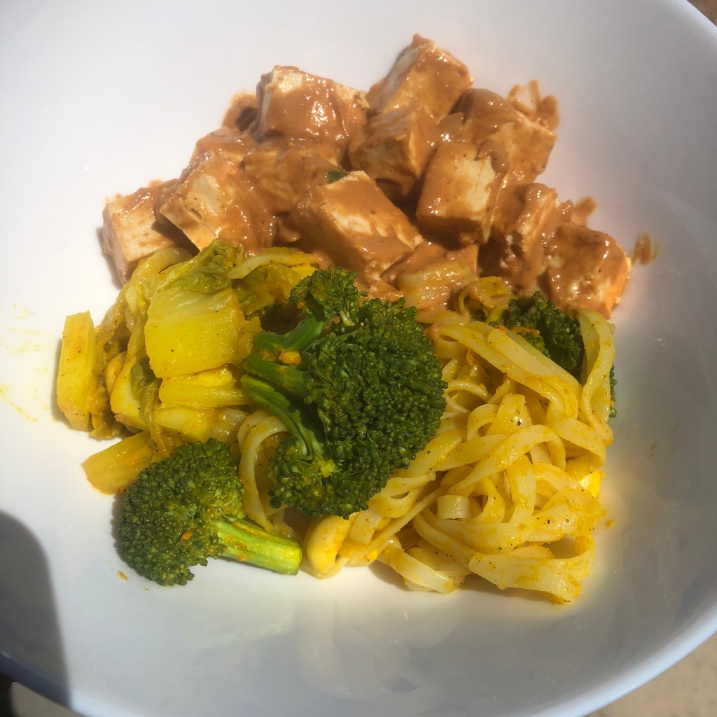 While the tofu was simmering in the delicious sauce, I put my veggies in the water with the ginger, and garlic, and stirred. I added 1/2 tsp salt, 1/4 tsp pepper, and 1 tbsp of turmeric, stirring well. Then I threw in a few cashews. I cooked this about 5 minutes, stirring occasionally, before combining with the rice noodles in the pan, when done.
