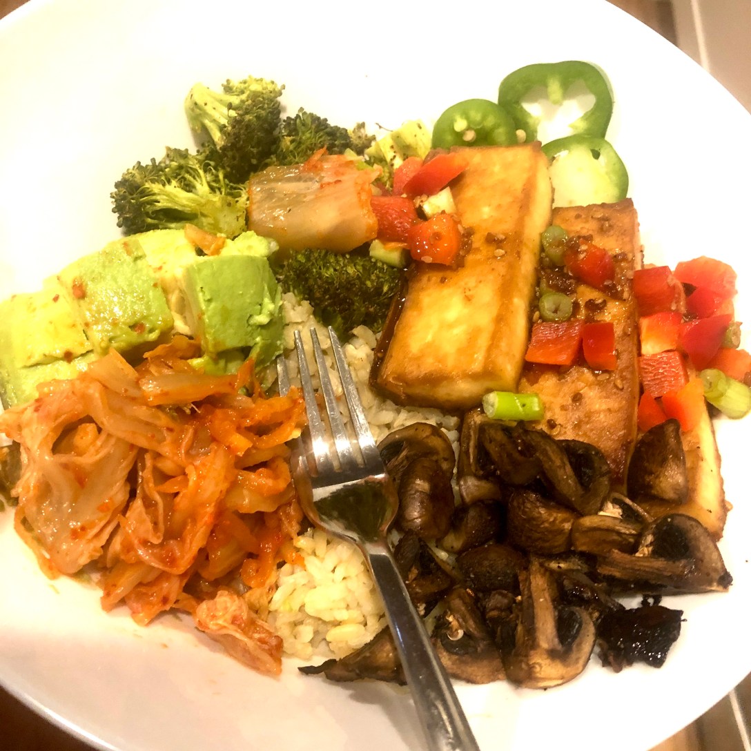 When it was all done, I served the brown rice, topped with mushrooms, broccoli, tofu, kimchi, 1/2 an avocado, and sliced jalapeños. I topped it off with some diced red pepper and green onion I had leftover from another recipe.