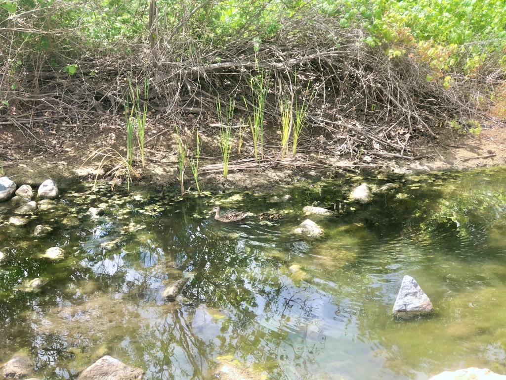 I happened to spot a mother duck and her baby ducks, bathing in the algae laden stream.