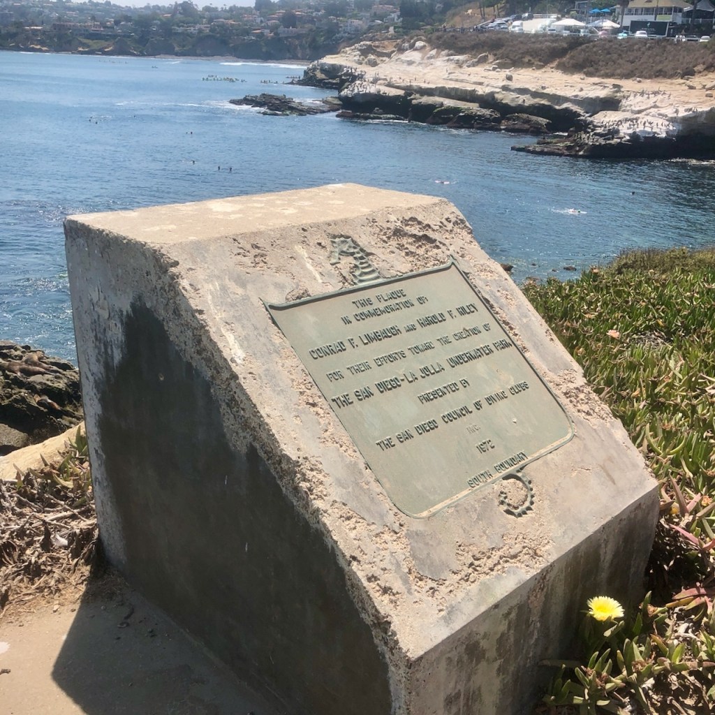 I arrived at La Jolla Cove, marked by this plaque describing it’s famous underwater park, just offshore. It is a popular destination for divers, and kayakers. However, there have been shark attacks here, with one fatality. So as a rule of thumb, where there are sea lions, there are sharks, since they are a major food source for them.