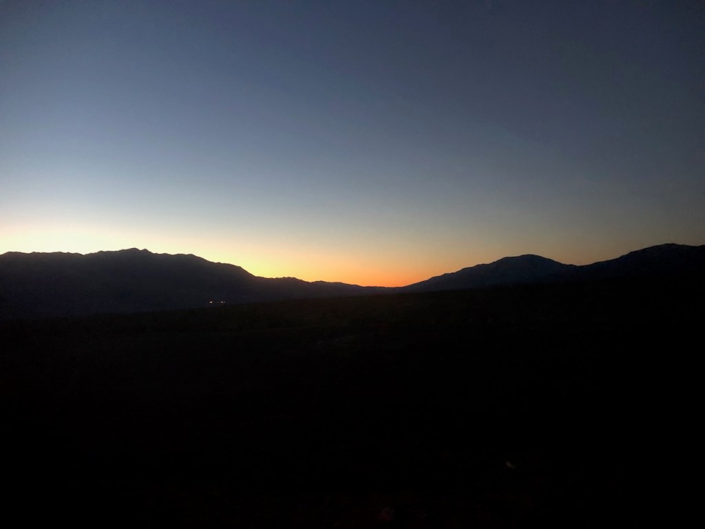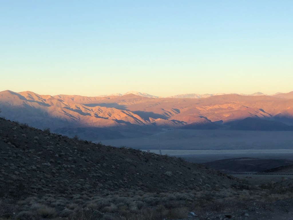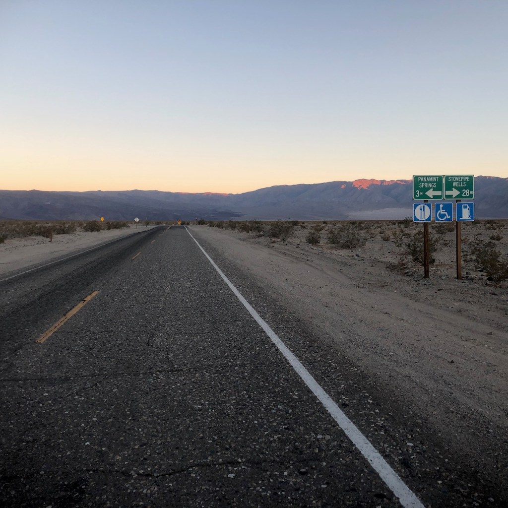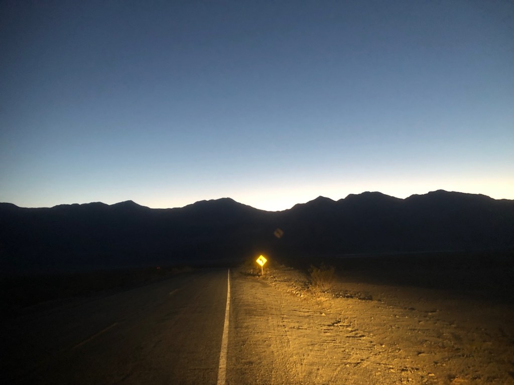 I could finally glimpse the outline of the mountains of Death Valley at first light. Otherwise there was total and complete darkness around me, not even another headlight to speak of.
