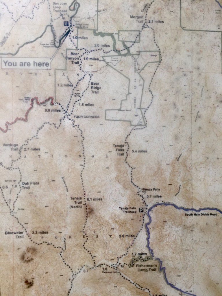 You will find a map here of the area by trailhead, adjacent the parking lot. If you have not downloaded a map in advance, you might at very least take a photo of it so you have a reference, in case you get lost. There are many side trails on this hike, and it gets confusing in some spots to know which trail goes to Sitton Peak.