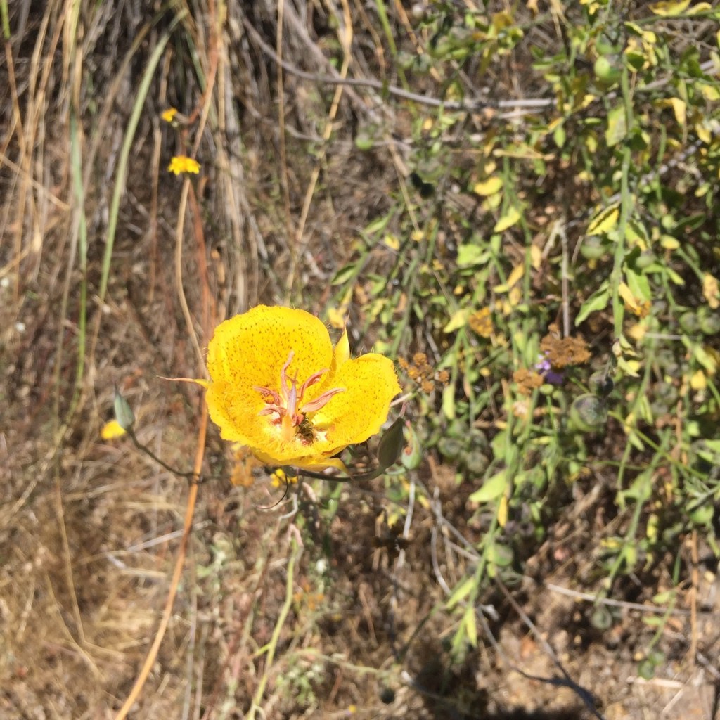 As I climbed higher along the ridge toward the first trail split, where bear valley trail branches off, the trail became overgrown. There were lots of small yellow blossoms of deerweed.