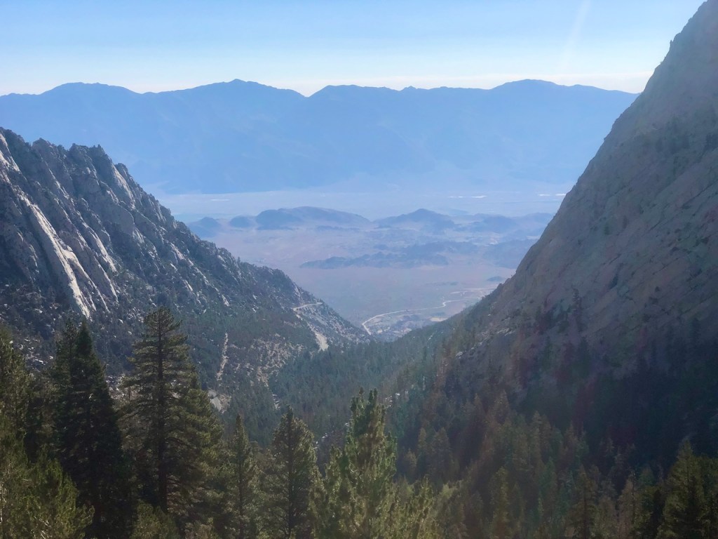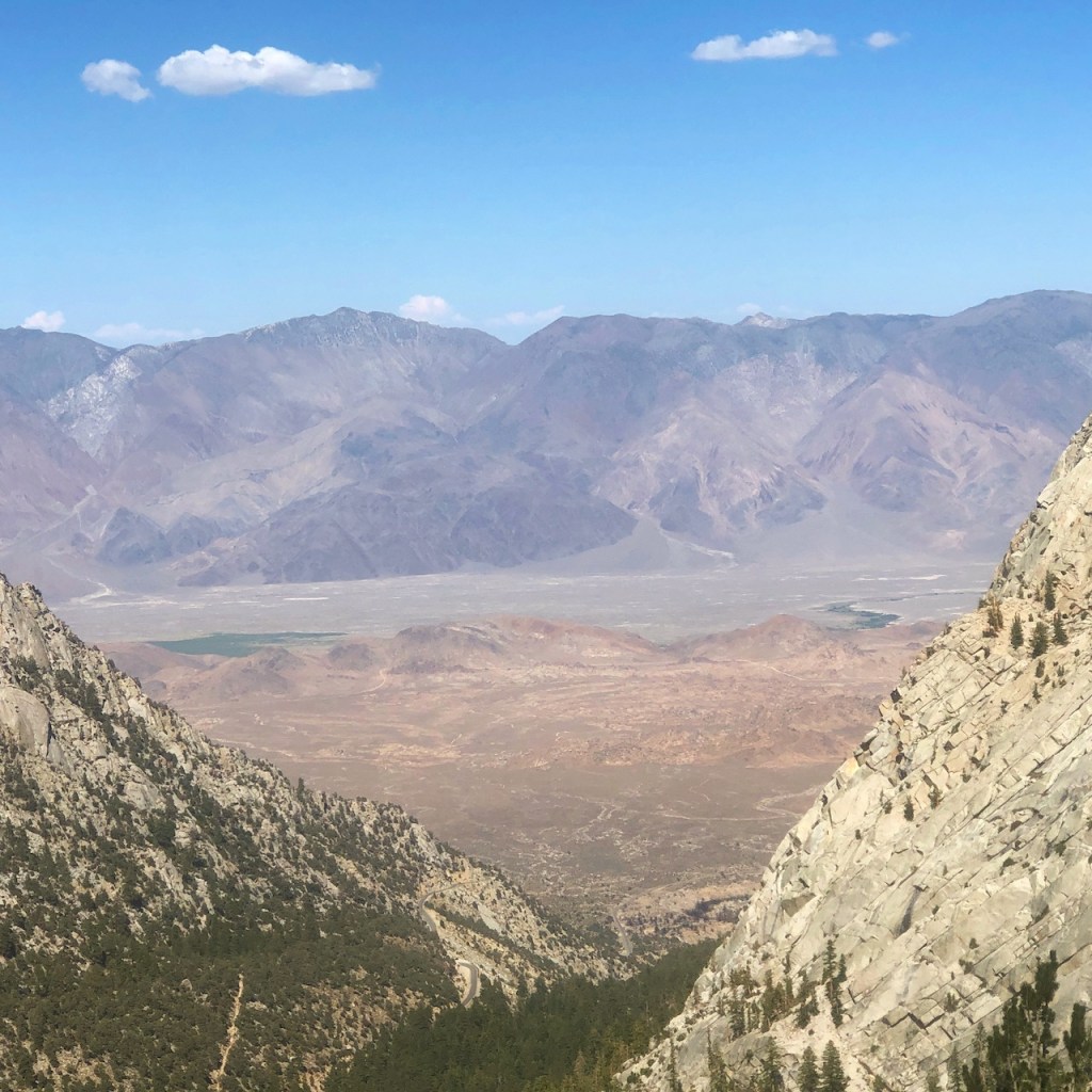I made it back down the last stretch of trail to the portal, down several switchbacks. There was a unique and amazing view off in the distance, stretching from the granite cliffs of Whitney Portal, to the red sun baked foothills of the Owens Valley, to the purple mountain peaks of the Inyo Mountains. It was so beautiful here.