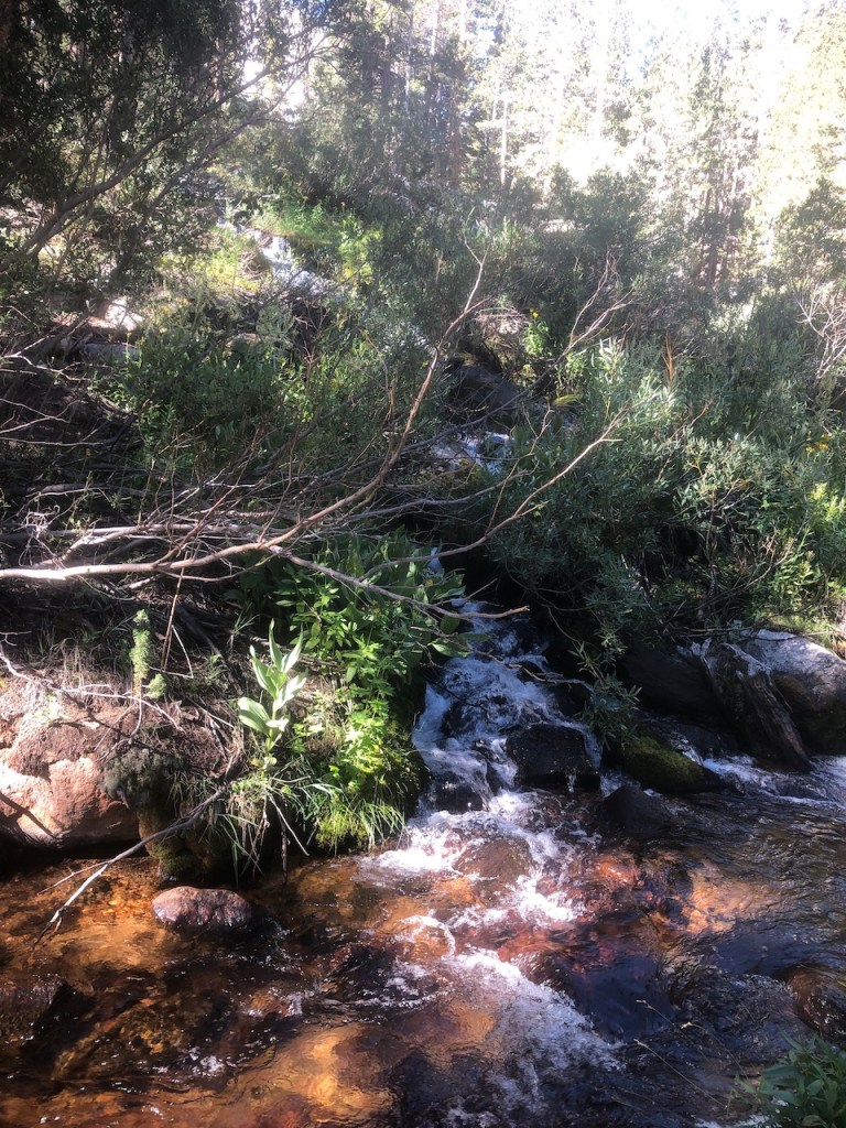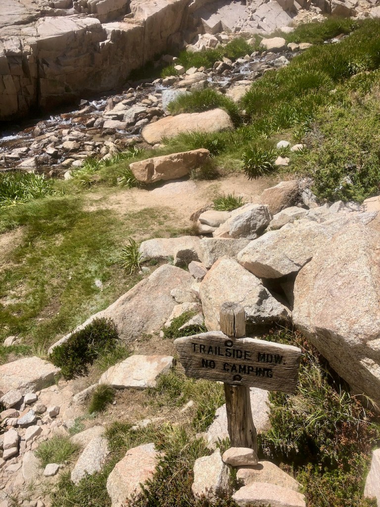 As I entered what I consider a proper meadow, there was water flowing everywhere. It was green and so lush in this section, as I approached Outpost Camp, which is the first allowable campsite, on the way to Mount Whitney, for those staying overnight.