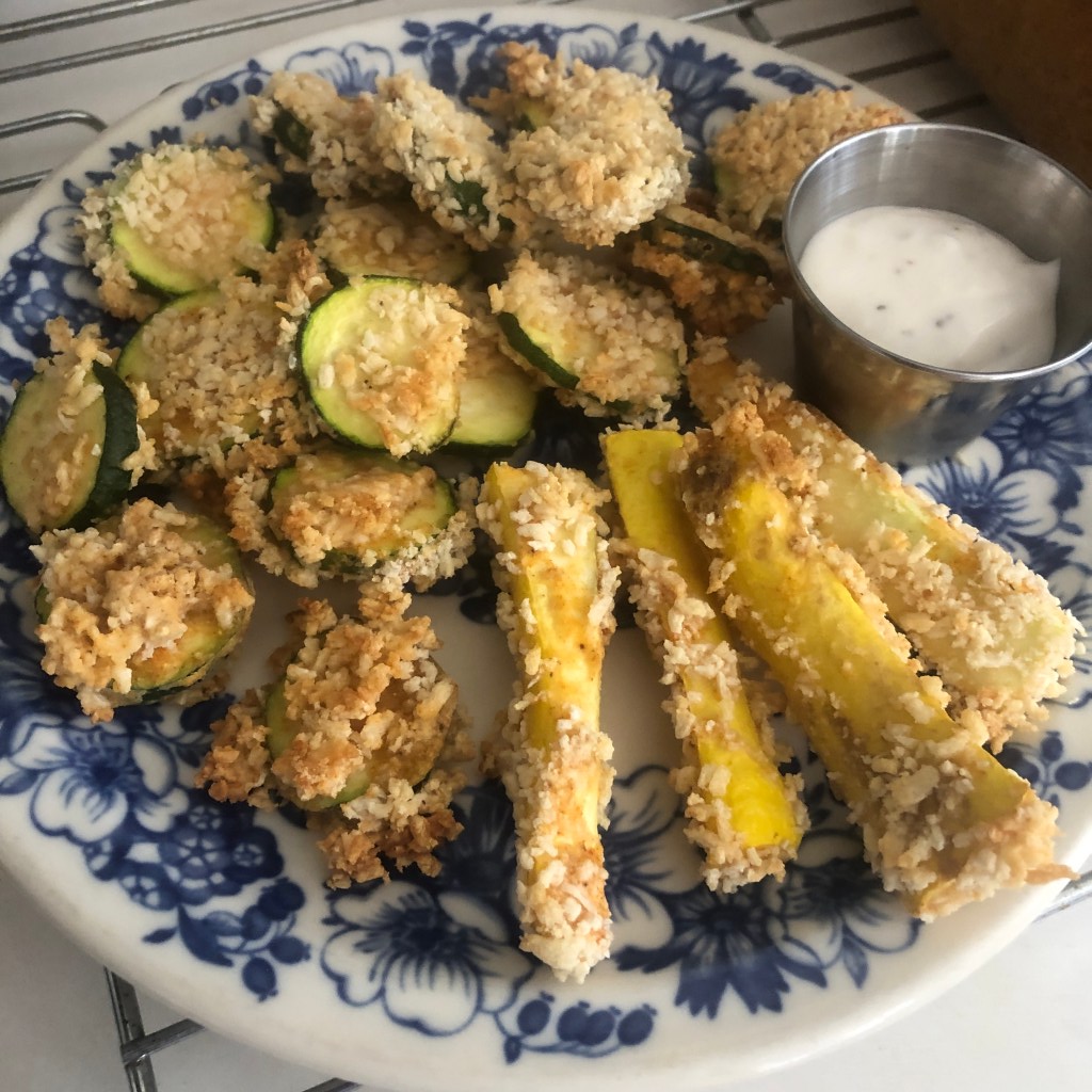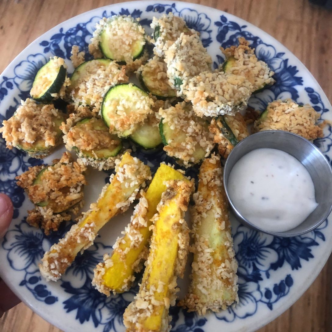 I happened to score some gluten free panko crumbs at the store. That meant fried zucchini was happening. In addition, I was making a healthy version baked in the oven, and not using any eggs. So this is also plant based, and vegan friendly.