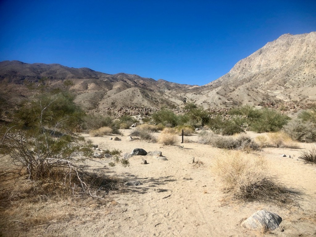 I headed off towards the Bear Creek Oasis from the Cove Trailhead in La Quinta, CA in February. Winter and spring are the best times to visit here. There is a large parking area, and is a popular place to hike. There are plenty of signs, picnic tables, and a restroom here at the trailhead.
