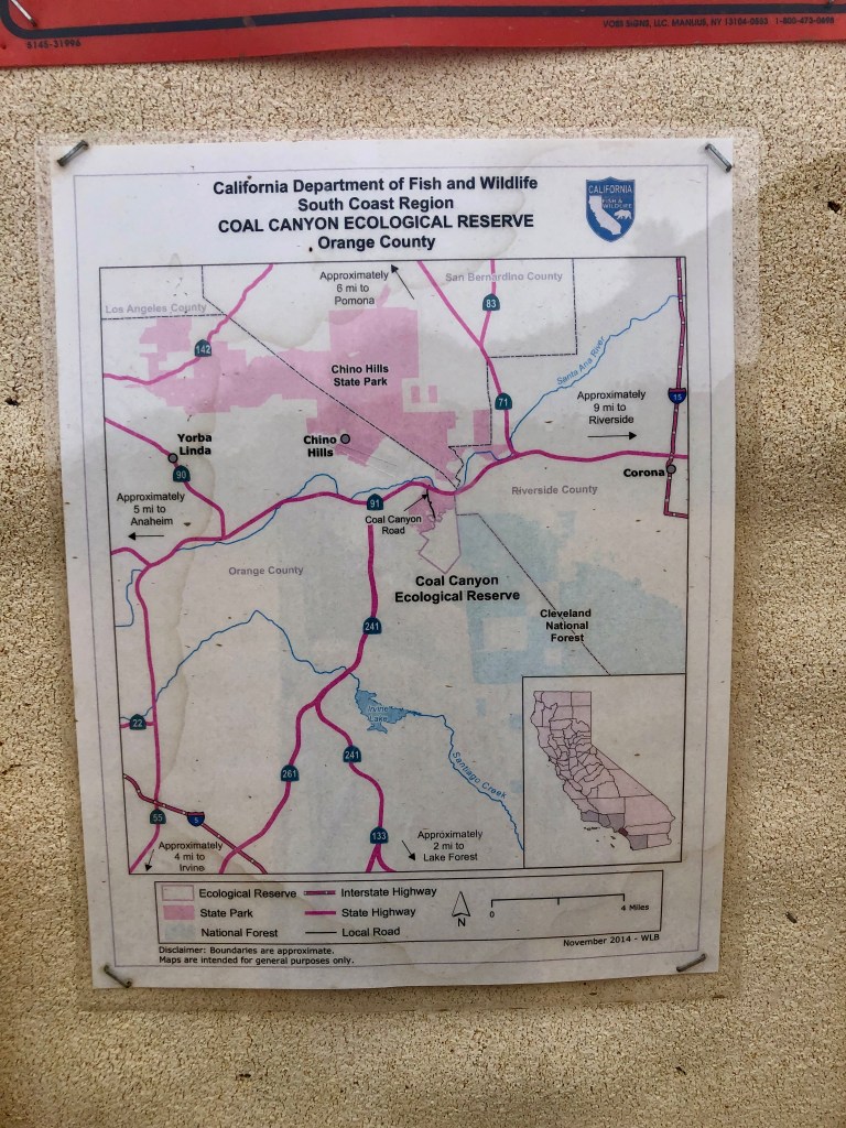 We would be hiking from the Orange County side, up Coal Canyon past Fremont Canyon and the Cypress Reserve. The most popular route to Sierra Peak is via Skyline Drive. Other routes includes the ultra steep yet shorter Fresno Canyon, and Pipeline trail, created by power companies to access their lines.