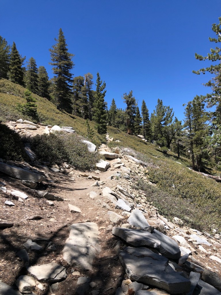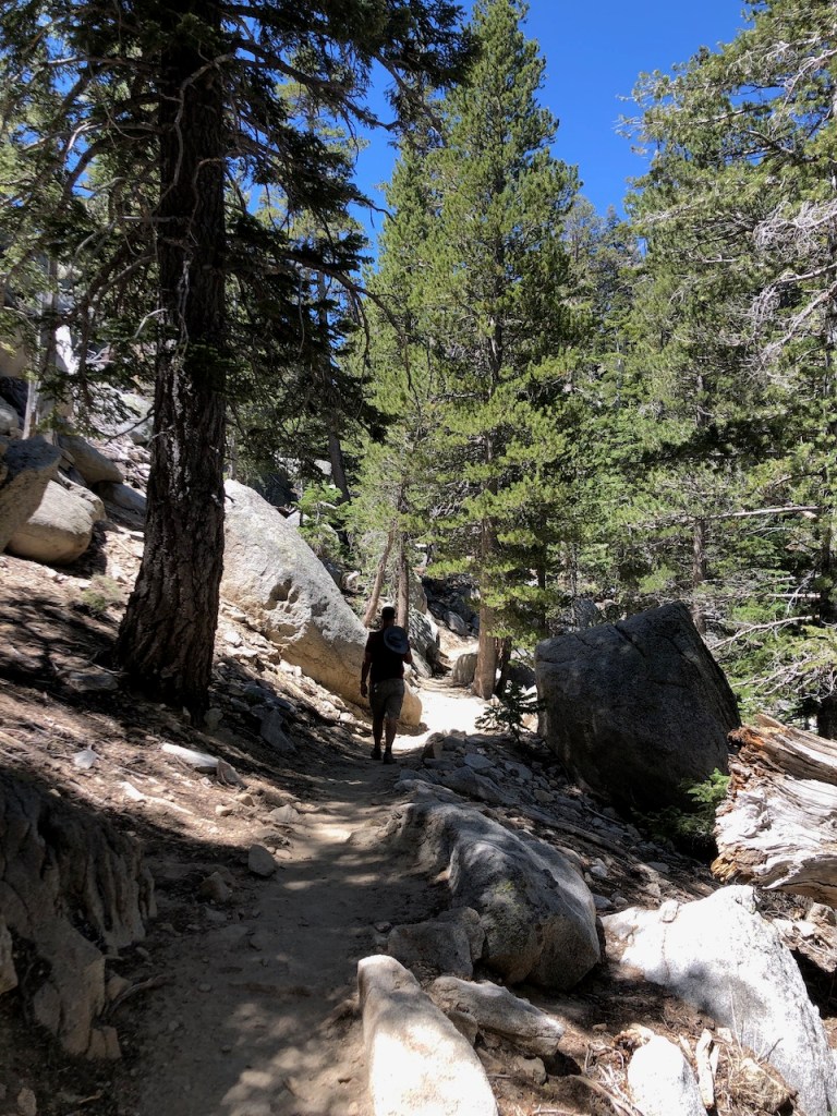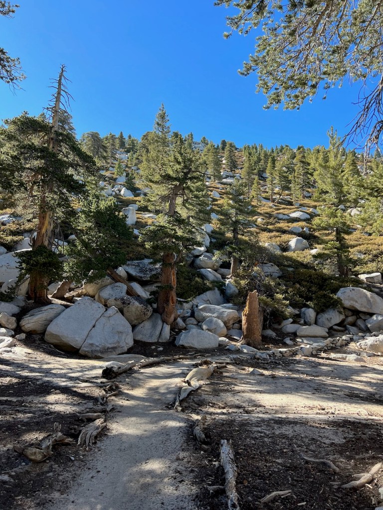The trail is well maintained as it winds its way through pines, and large rocks.