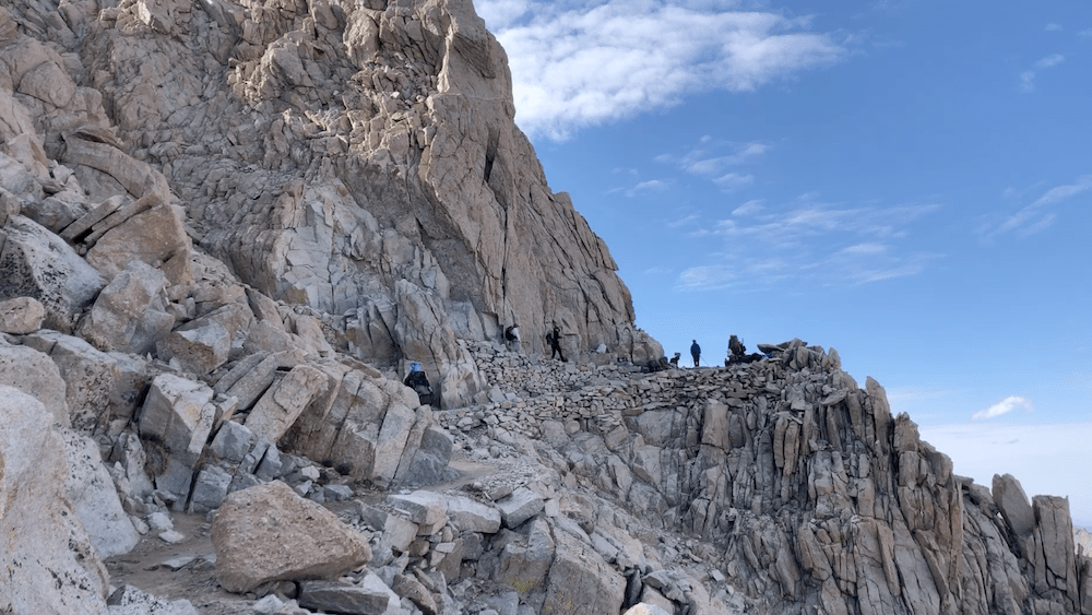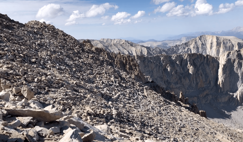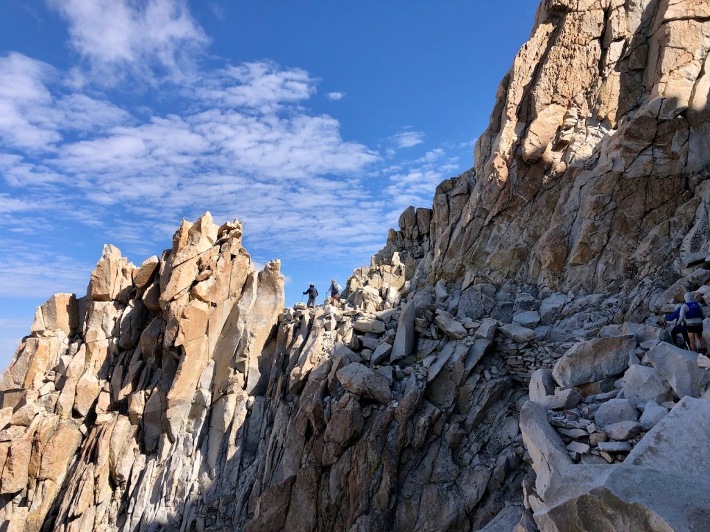 The trail along the ridge to Whitney is one of the most rocky, narrow, and rugged trails over granite slabs, I have ever experienced. There were plenty of places you needed to use caution, since some of the cliffs dropped off hundreds of feet on the right, and on the left, a few drop offs seemed to be close to a thousand feet. I steered clear of the edge.