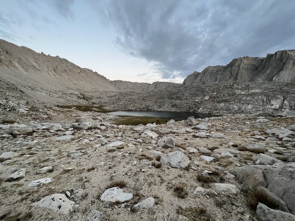 This alpine lake actually has golden trout swimming within it. Without a connected stream, I wonder how they even got here to begin with? We camped just north of the lake around 7:30pm, as the light was fading. It worked out since we preferred to camp away from the crowds anyway, to avoid hearing chattering while we slept. I had run into a group of chattery young women earlier in the day who were hiking the JMT to Guitar Lake. These ladies claimed they would start their Whitney ascent around midnight or 1am, in an attempt to watch the sunrise. They were likely camped by the lake. They were fast hikers, and I was not expecting to see them again.