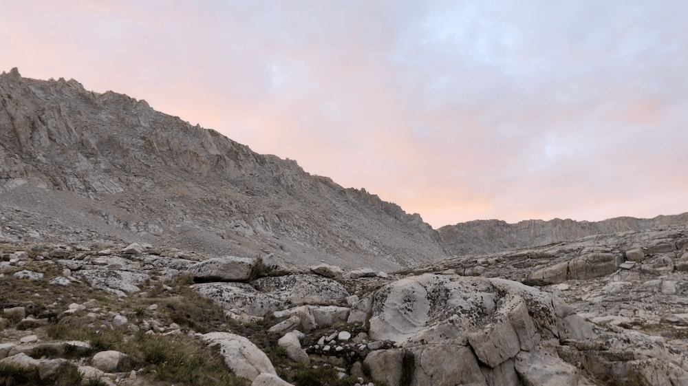 By 5am we were packed up, and hiking down the trail, saying goodbye to Guitar Lake. We left much later than we wanted to leave, but it was the best we could do. It was pitch black at 5am, and we were literally hiking into the unknown in total darkness for the first half hour. I would watch and follow the blink of headlamps, leading the way up Mount Whitney. We knew where we needed to go, and just followed the lights. By 6am, the sun was rising and that famous alpen glow was illuminating far off peaks, as we began our climb towards the trail up Mount Whitney.