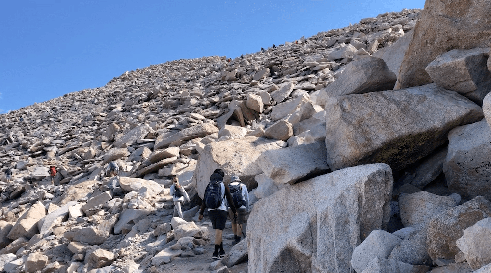 We had begun our hike around 5am, having woken up at 3:30am. So the entire 3500 feet of climbing took us 8.5 hrs. We took several breaks on the way up, and had heavy packs, for 2500 feet of the climb to Trail Junction, after which we took small day packs with just the essentials for the remaining 1000 feet to Whitney summit.