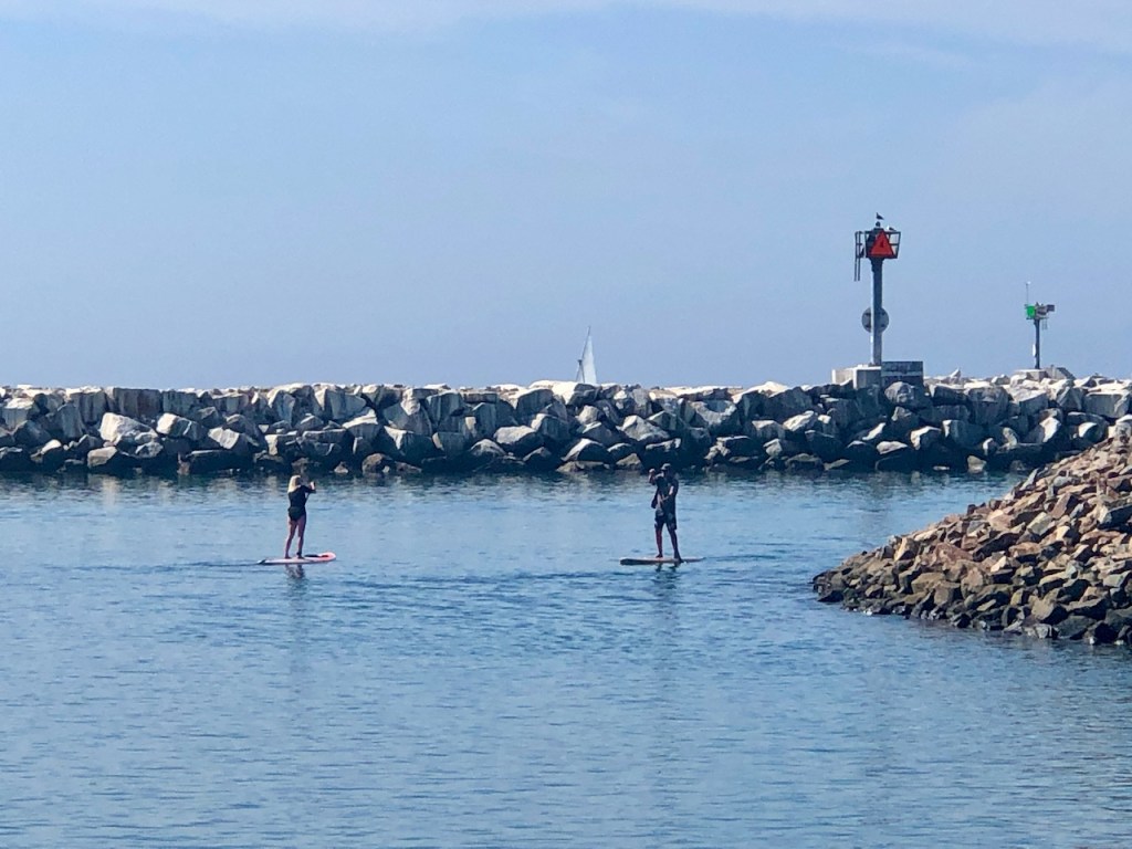 People were paddleboarding on this sunny day. There was very little wind, which makes for the best conditions.