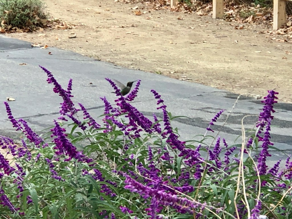 There were hummingbirds drinking nectar from the purple salvia planted along the trail.