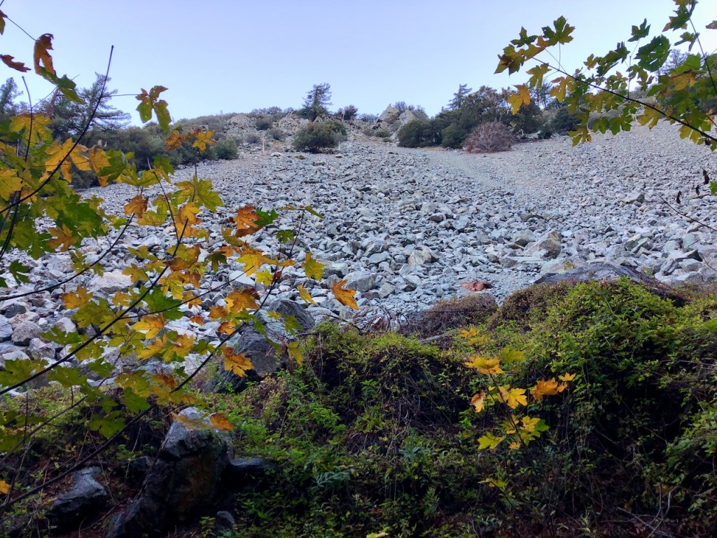 There really was not anyone around, and it would just be me today it seemed. I started making my way up this unknown trail, about halfway between the Notch and Ontario Peak. After ¾ of the way to the ridge, the trail just disintegrated. It had disappeared in the loose talus. It was a maze of small pine trees.