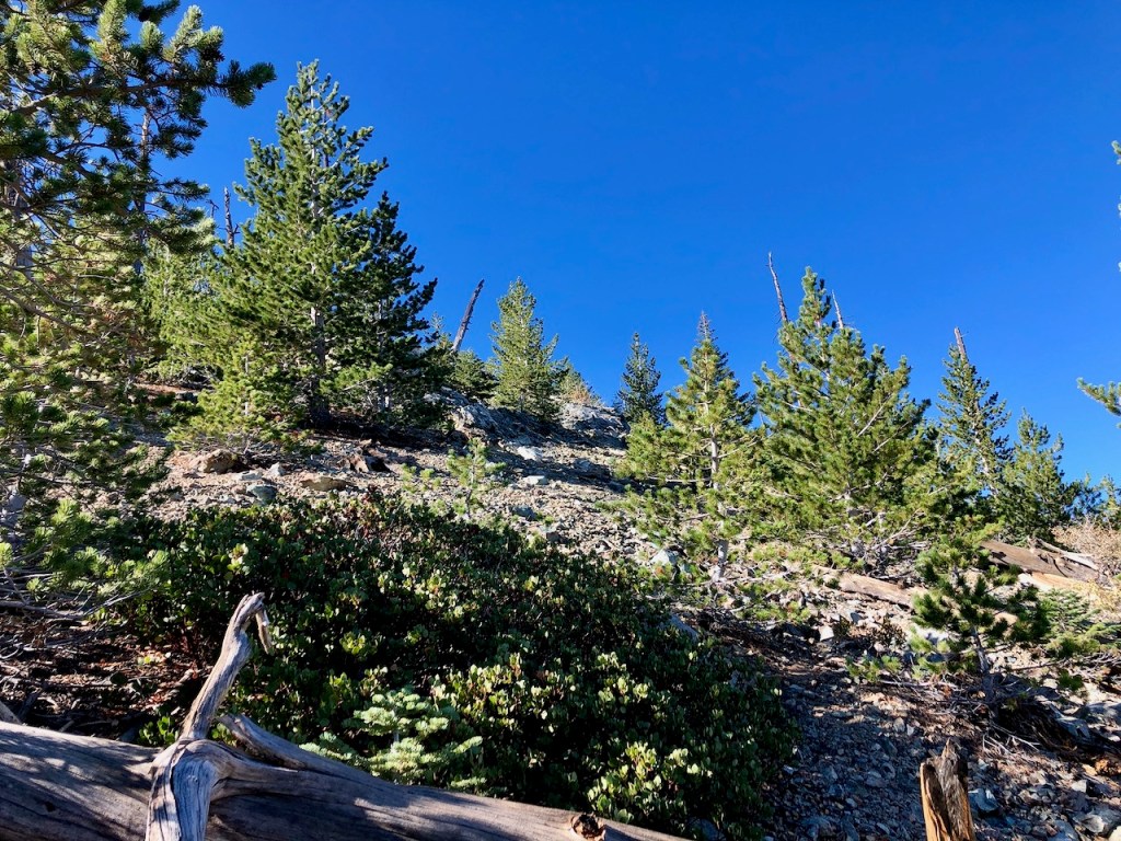 There was supposed to be a trail, up the steep side of Bighorn Peak, or perhaps it was more a route, that involved a bit of bushwacking. So I decided find out, and try hiking straight up to Bighorn Peak from the saddle, based on an alltrails community-created trail map I had saved.