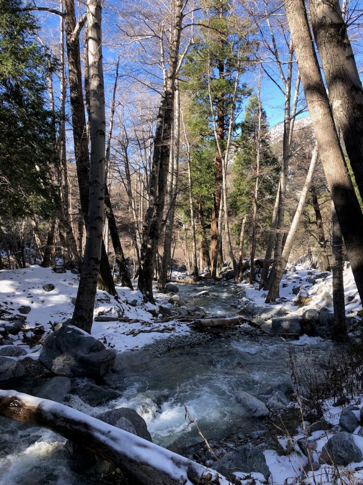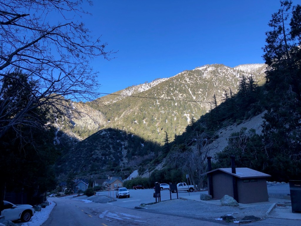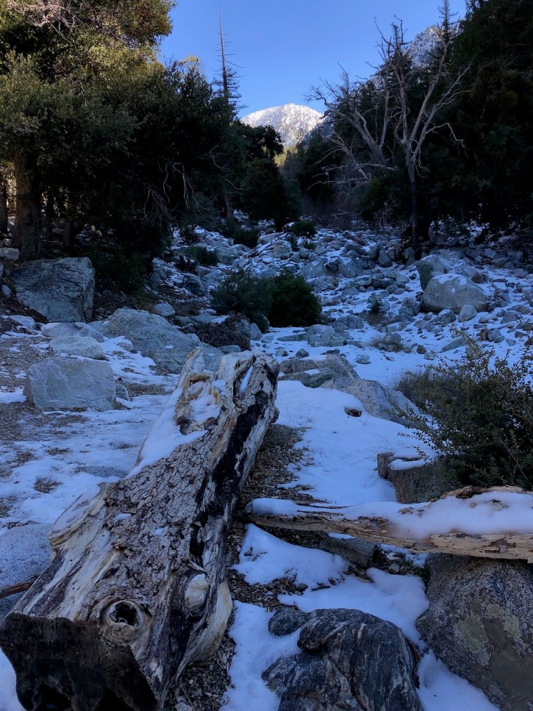 We decided to hike up Icehouse Canyon, to see the waterfalls flowing in winter, during a recent snow. The road to the parking area was clear. There were however signs along the roadside reading “Hiking Not Advised.” This was likely due to recent missing hikers on Mt Baldy, including one who is famous, the actor Julian Sands.