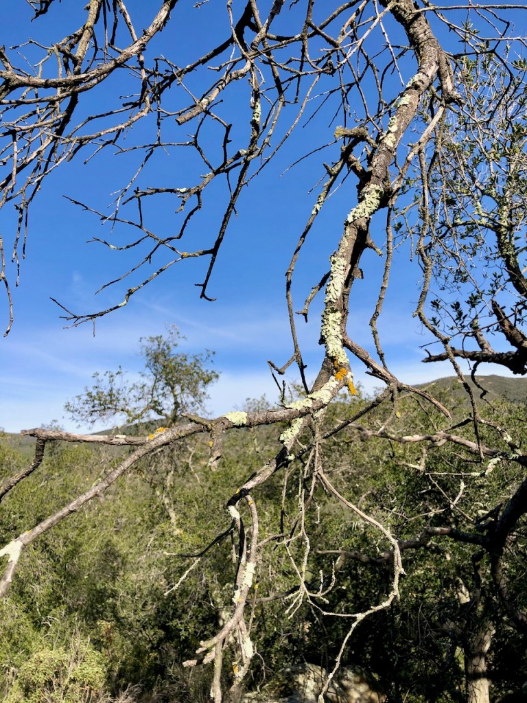 There are several species of oak here, some with acorns, and others with lichen covered branches.