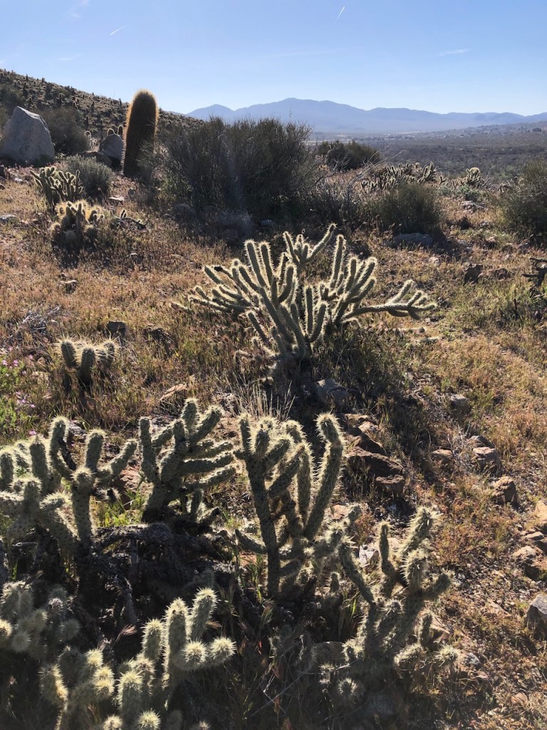 This would be Grapevine Mountain, and the hike up to this peak is apparently unmarked, even though alltrails lists a path to the summit. I’ve been to that party before. I recently hiked up a nearby desert peak with no trail, decorated in similar fashion to this terrain, cholla, cactus, and yucca. I got stuck many times, and was not ready to repeat that scenario. Best of luck to whomever attempts Grapevine Mountain.