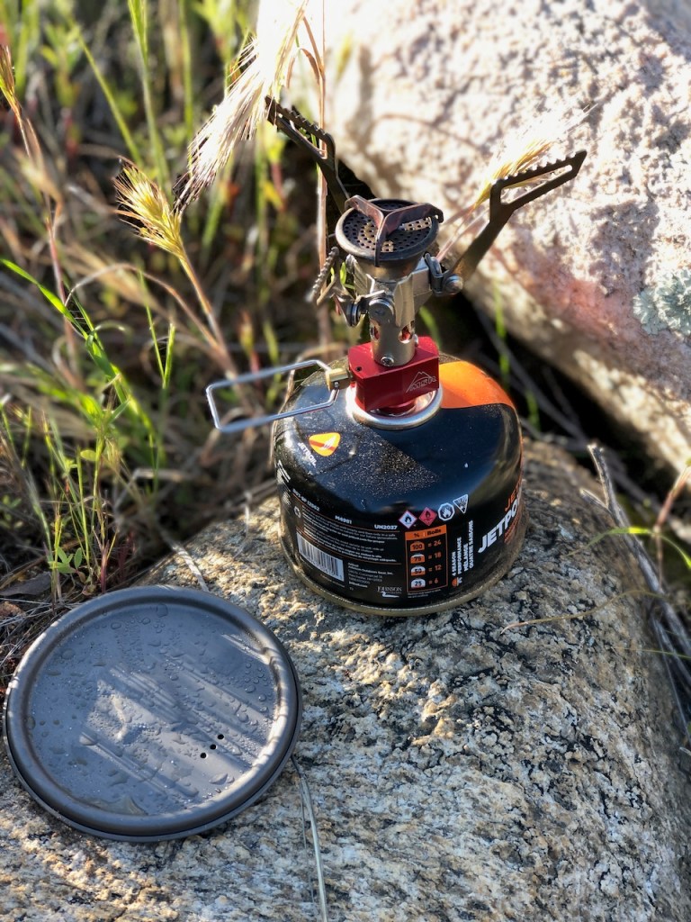 The site was next to a pile of rocks, which could be helpful for leaning my bag against, along with placing my cook stove on. There were an abundance of rocks to place on my tent stakes too. I found the rocks were all too uneven and jagged to sit on, and barely level enough for my stove. But I would have to make it work.