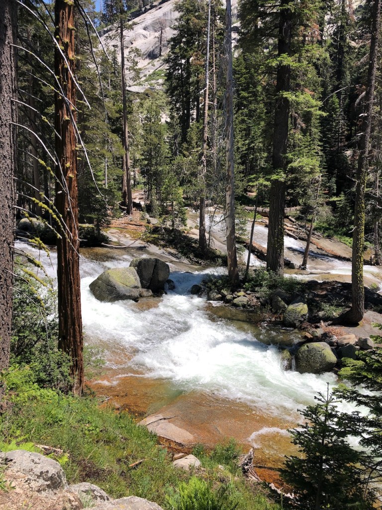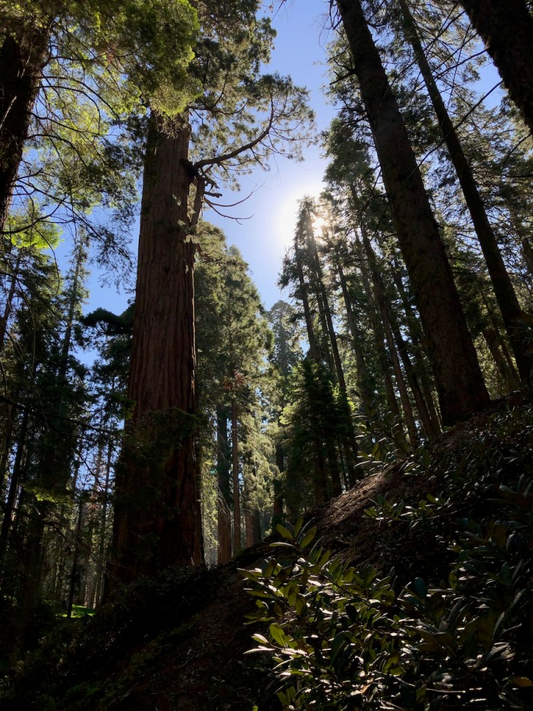 Your hike begins through a shaded canopy of sequoia trees, some of the oldest trees on earth. The terrain is paved, with a steady incline, right from the start. You head downhill towards an expansive grove, through a variety of vegetation,in a forest of sequoias and conifers. You will cross a variety of small bridges along the way, and encounter a small waterfall or two.