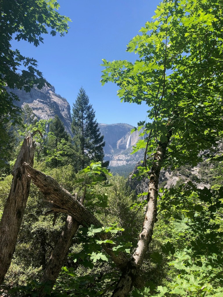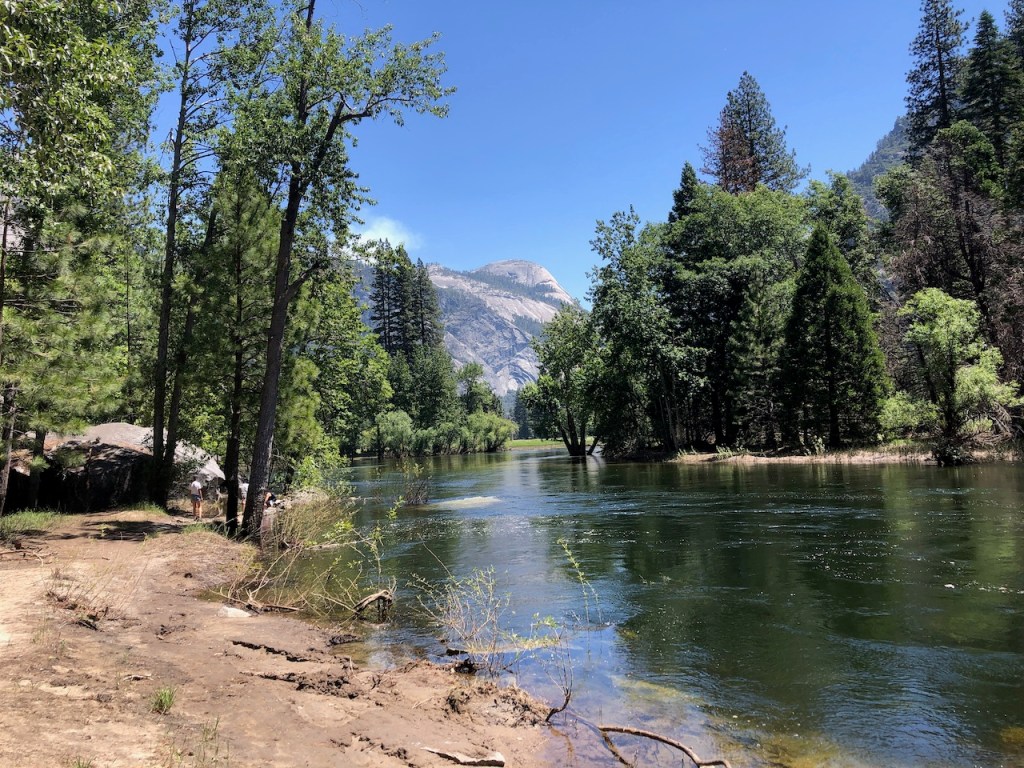 I had come to Yosemite to experience all this beauty with my boyfriend, continuing our summer camping and road trip. We started our day hiking from the parking spot we found, along the Merced River, just past Camp 4 and the Yosemite Lodge. The Valley Loop Trail along the river was damaged, muddy, and washed out in areas, due to recent rains. There were gnarled logs, branches, and the like, where the trail used to be. We ended up walking along the road at times, for this reason.