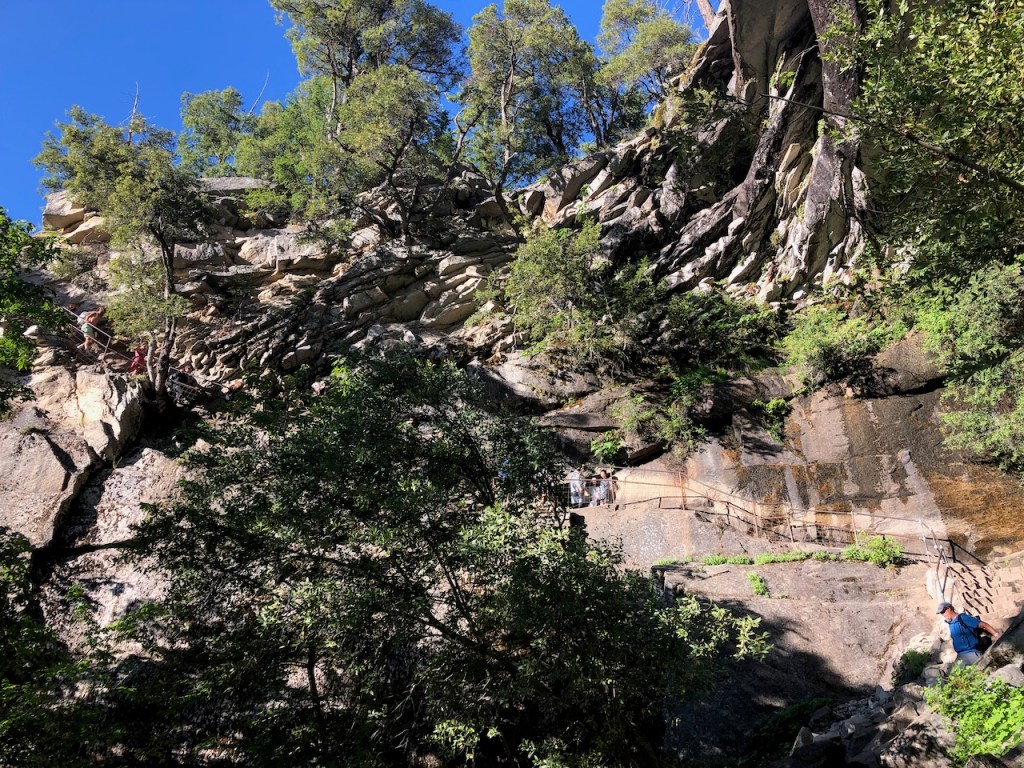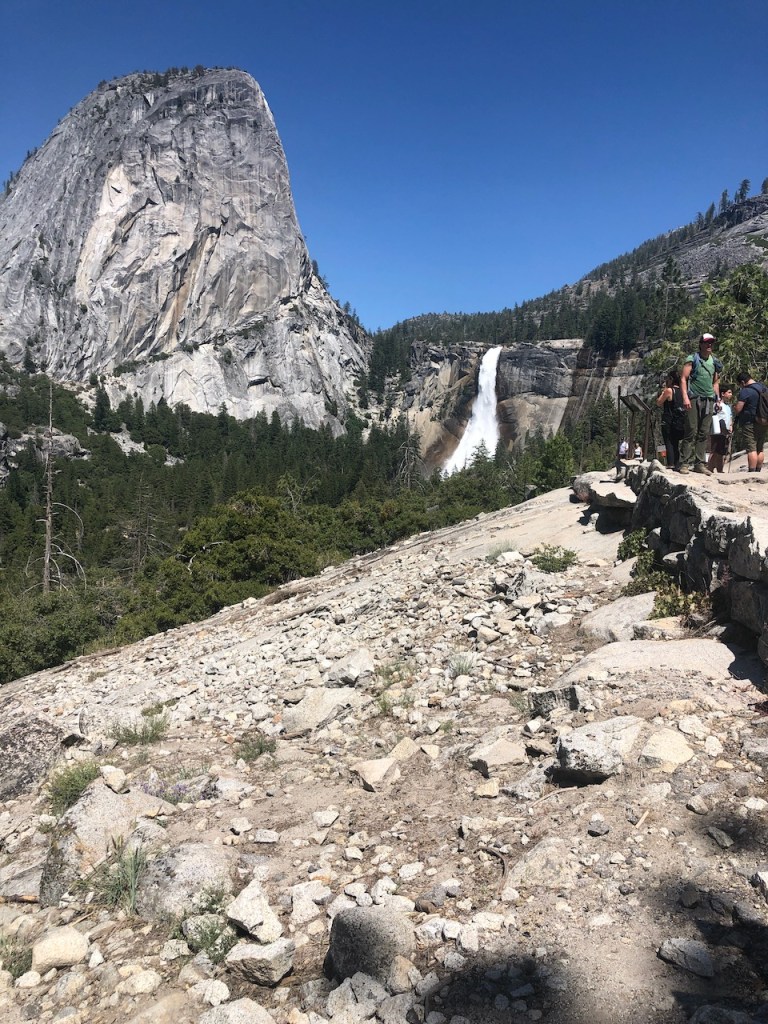 We continued on down the Mist Trail, which was very steep, and had lots of stone steps. There were beautiful rainbows in the mist of Nevada Falls. We entered a forest briefly, and got some reprieve from the heat once again.