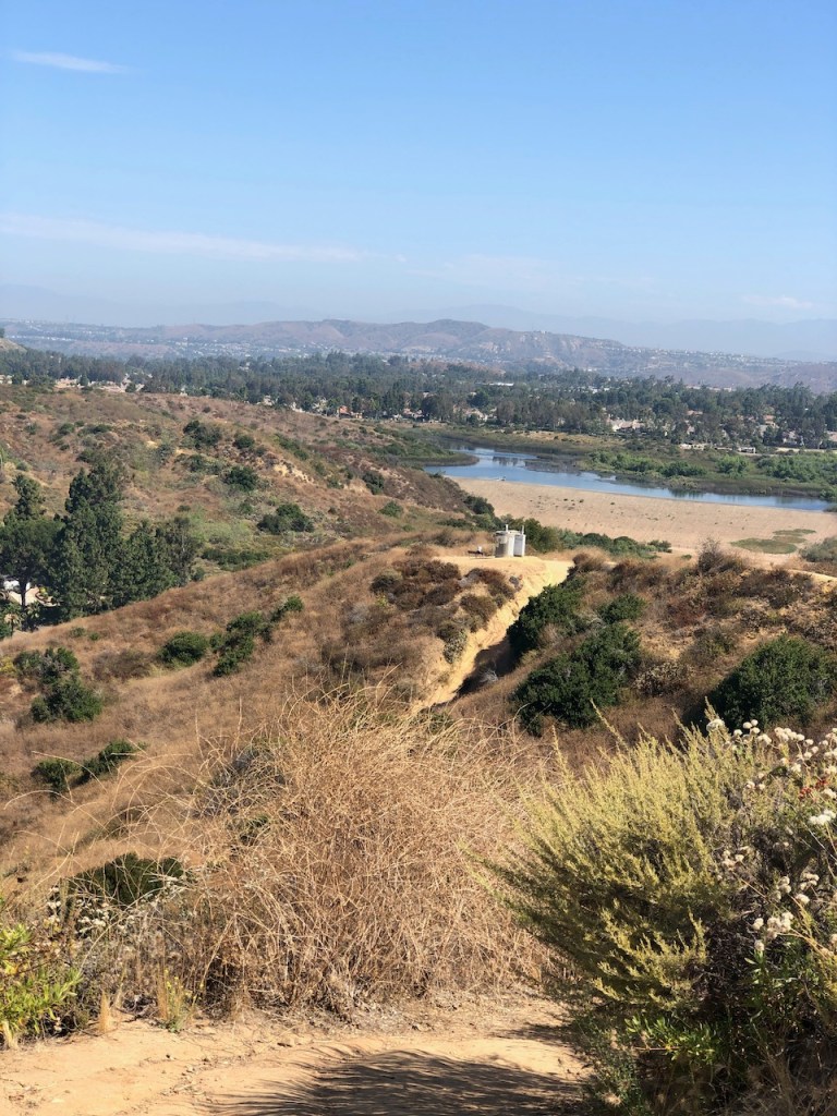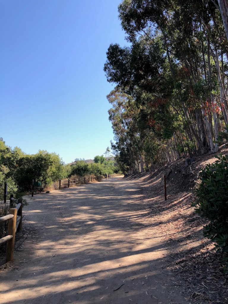 The trail is shared with cyclists, horses, and dogs are also permitted on trails, on a leash. There is a reservoir, and riparian area, along with a small creek within the park. Since it is located close to the Santa Ana mountains, and has it’s own wetland, there is a chance to see migratory birds, along with raptors, such as red tail hawks. The park has several forested areas of cottonwoods, and eucalyptus trees.
