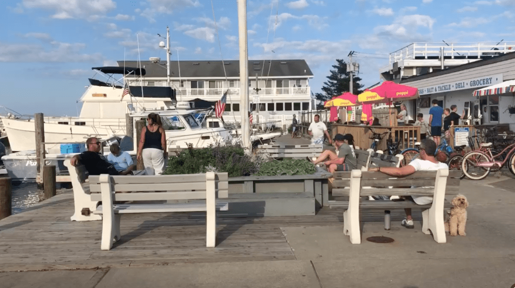 Here I found eateries, and a marina. People were hanging around throughout the bayfront, since this was the peak of summer. Everyone was in typical beach attire, some in flip flops, some barefoot, including the one police officer, who was standing there in a pair of shorts.