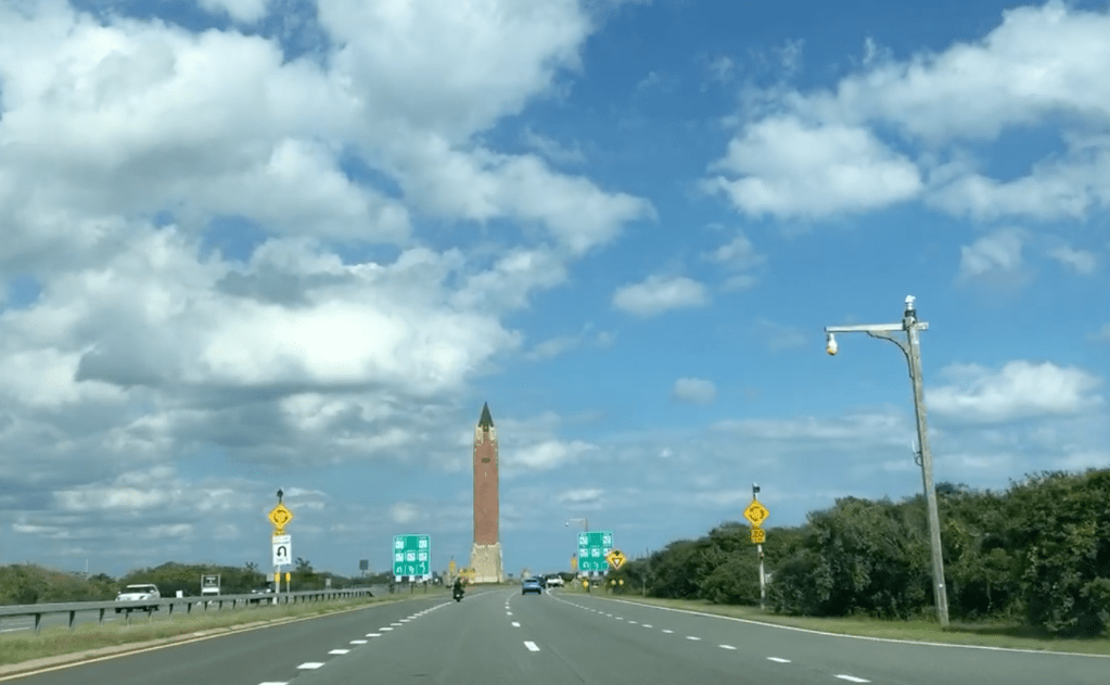 On this trip back east, I am revisiting places I remember from childhood. I pass by the beach parking areas of Jones Beach. I eventually approach a large traffic circle, with an ominous looking water tower in the center.