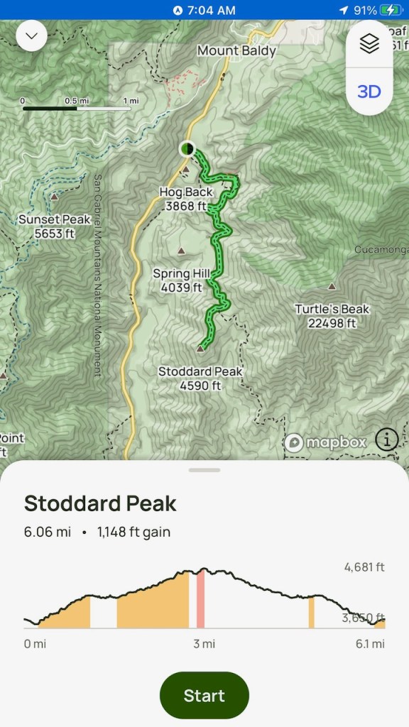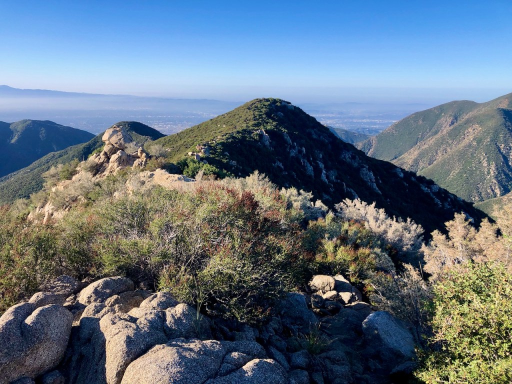 I hiked to Stoddard Peak, located in the San Gabriel Mountains of the Cucamonga Wilderness. Several mountain peaks surround this one, such as Sunset Peak, Sugarloaf Peak, Potato Mountain, and of course Ontario Peak. There is another prominence called Turtle’s Beak, which I have heard of people hiking to. That one sounds like a mostly off-trail bushwacking affair. Little did I know I would be doing some bushwacking of my own to reach Stoddard Peak today.