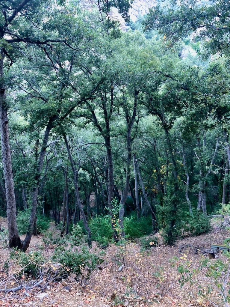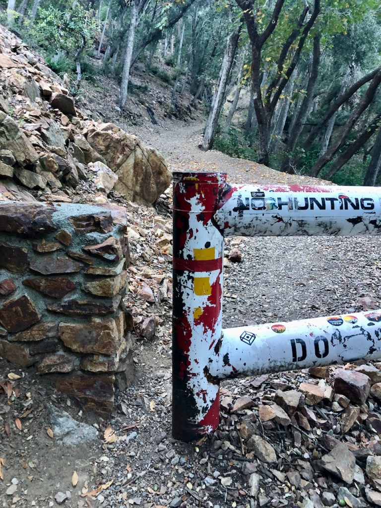 The wide fire road forked about three miles up, and I stayed to the right, heading off into the brush on a slightly overgrown, narrow, and steep singletrack trail.