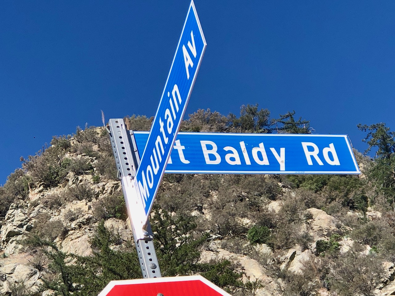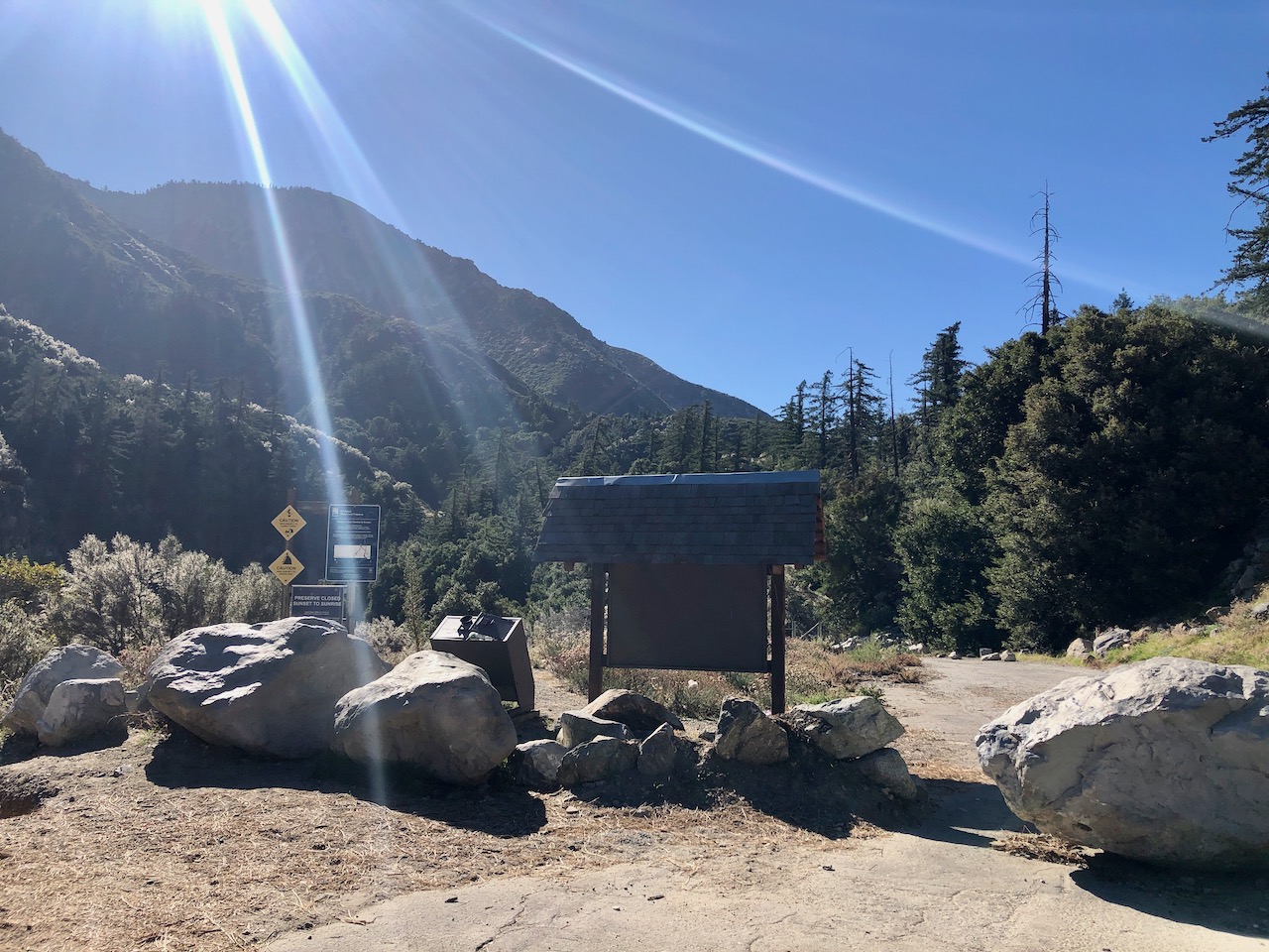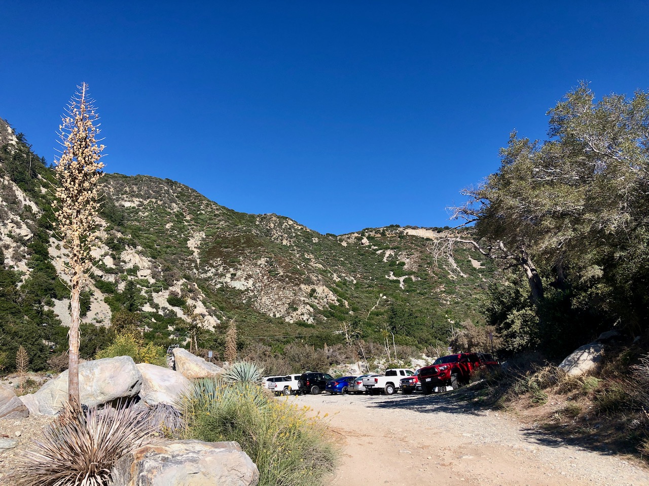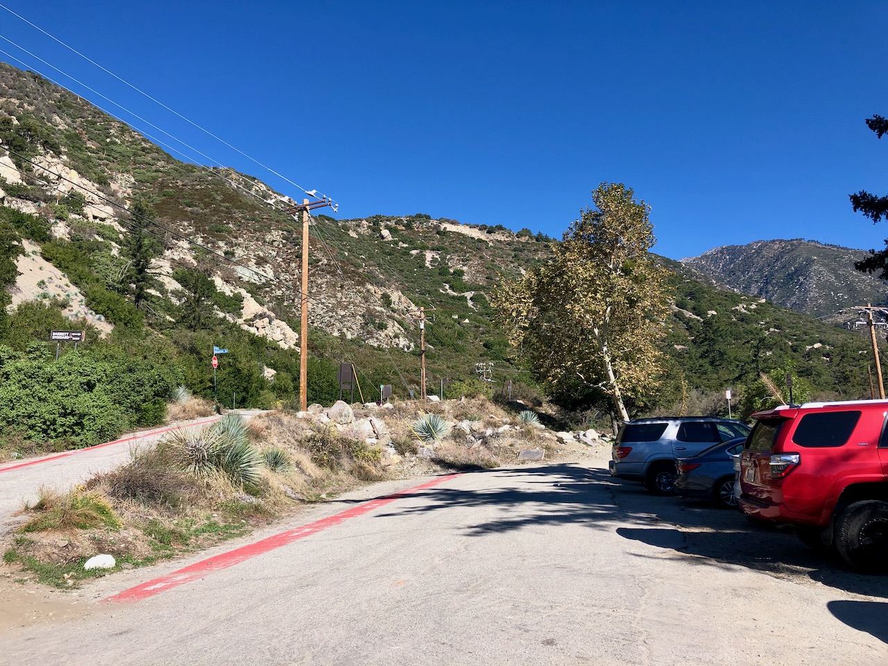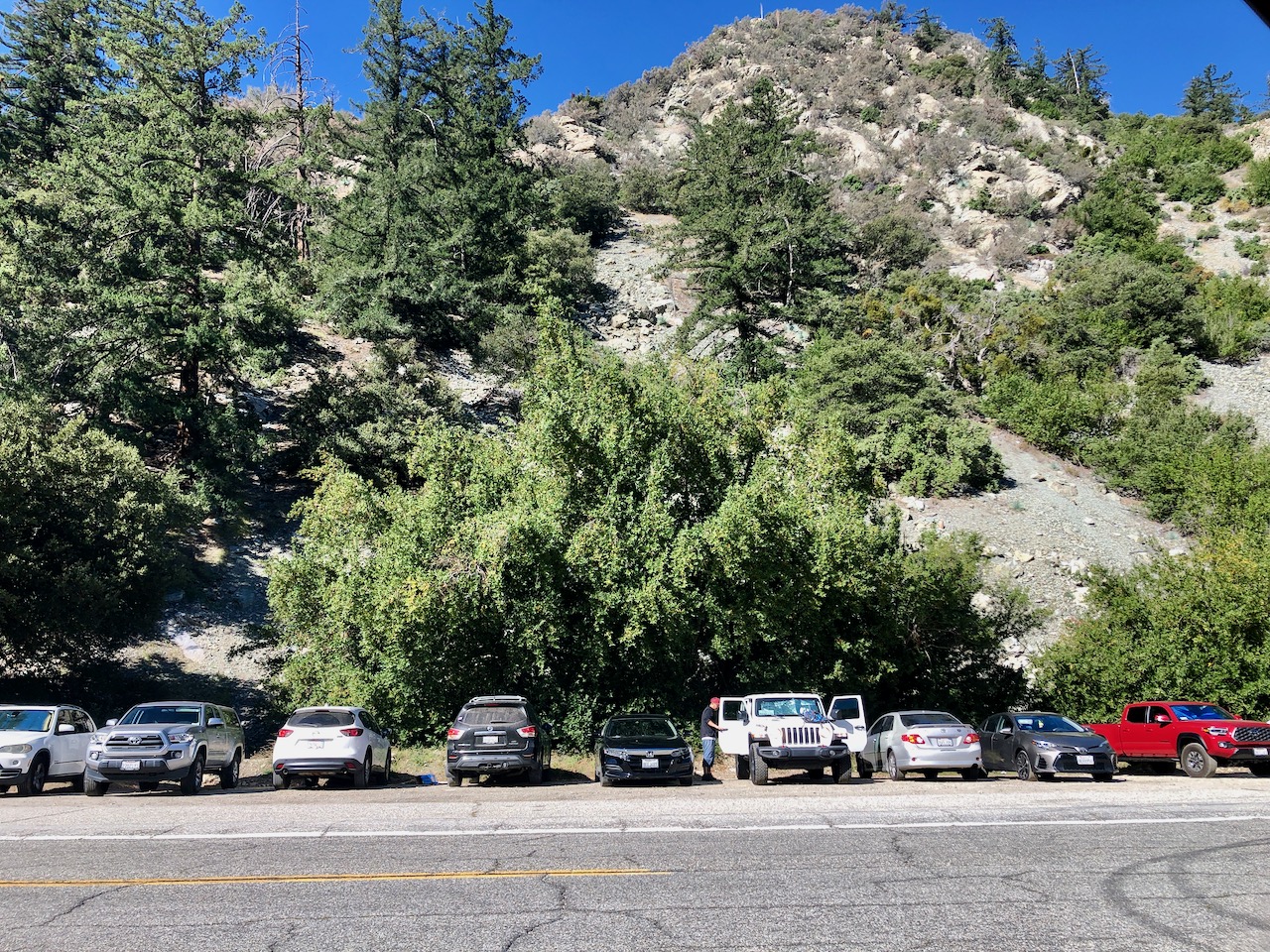 The parking lot is located at Mount Baldy Rd. and Mountain Ave. It was just after sunrise, and I was lucky to find parking here, on a weekend. There are two main sections for parking, an upper one with room for about 12 cars, and a lower one with about room for 18 more. There is also a parking area across the street for overflow.